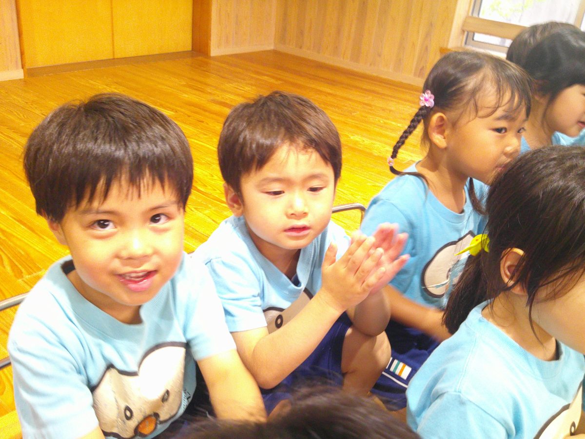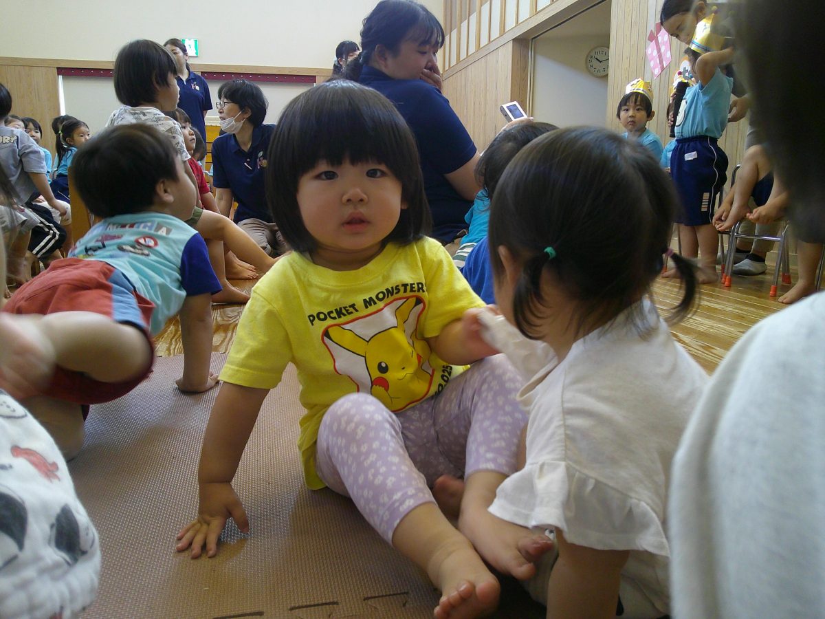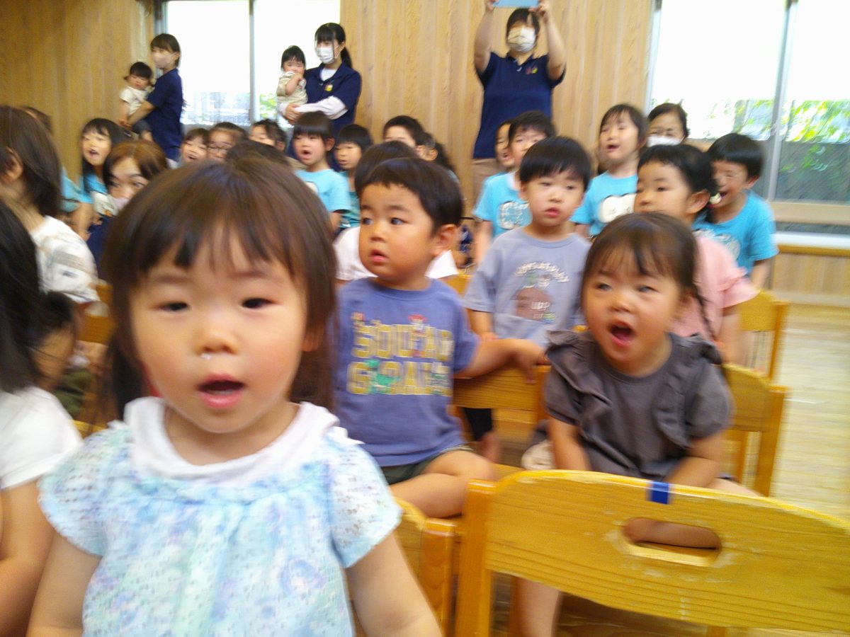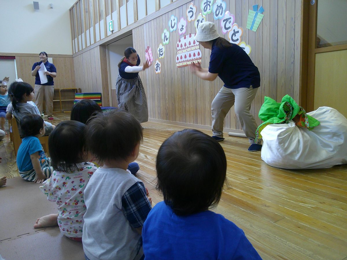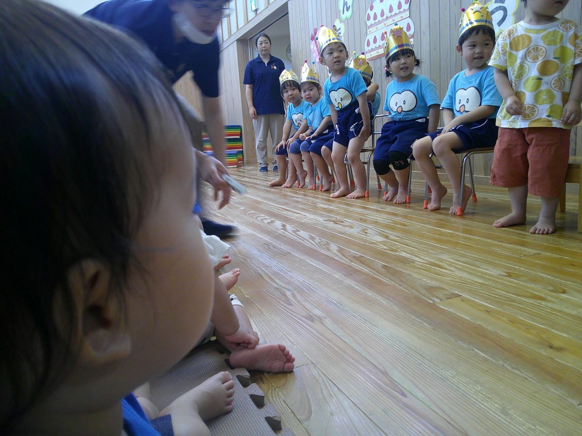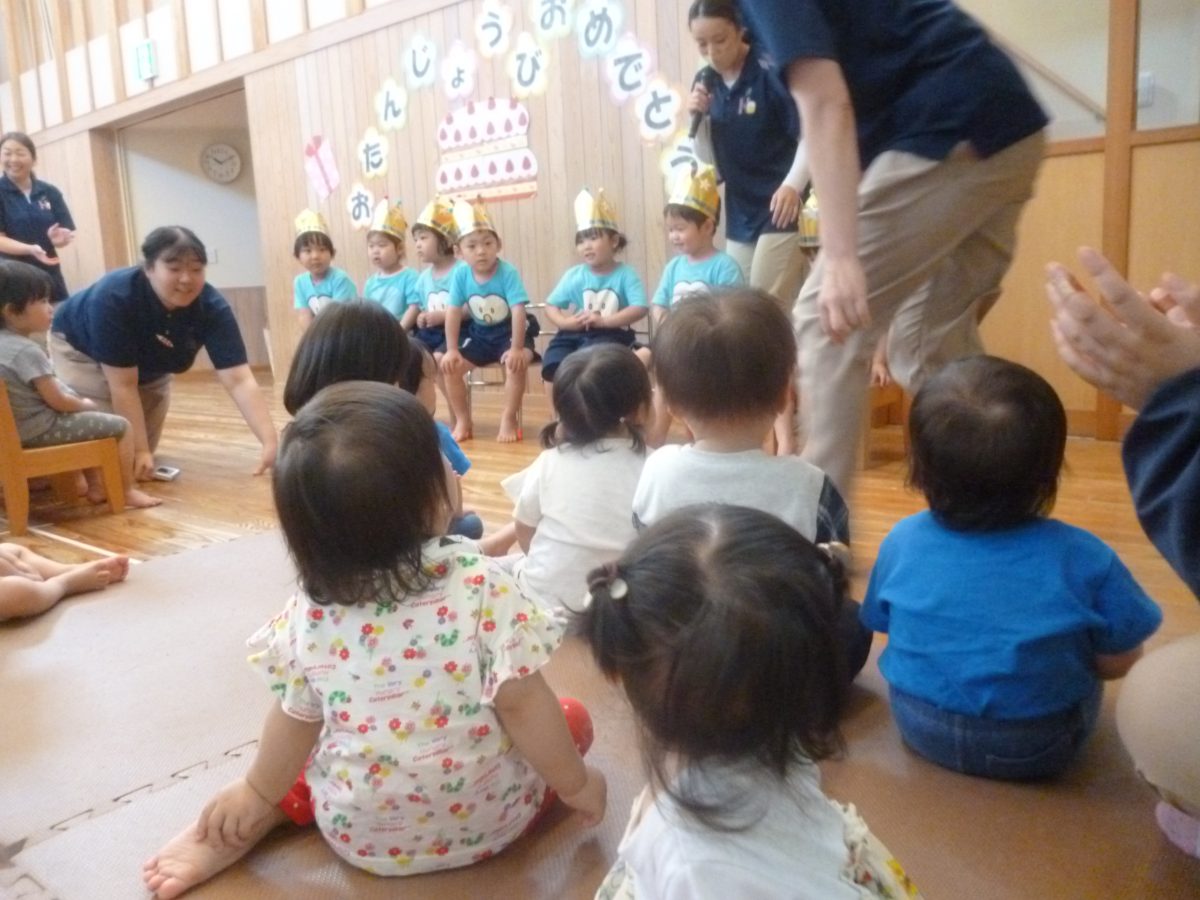 誕生会ではみんな夢中で、出し物や誕生日の友だちを見ていました🎂