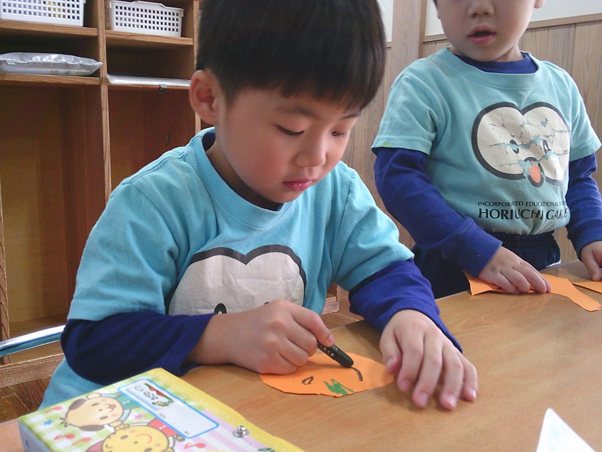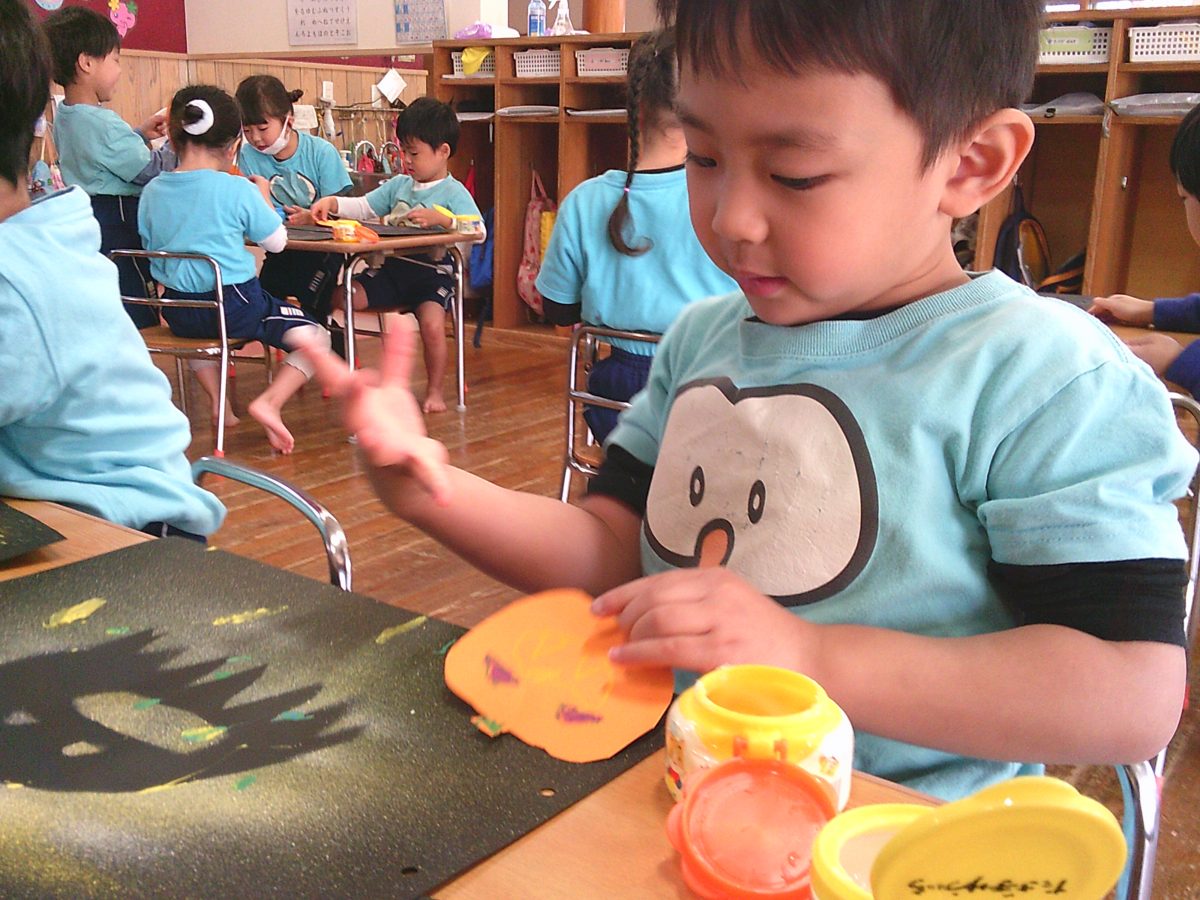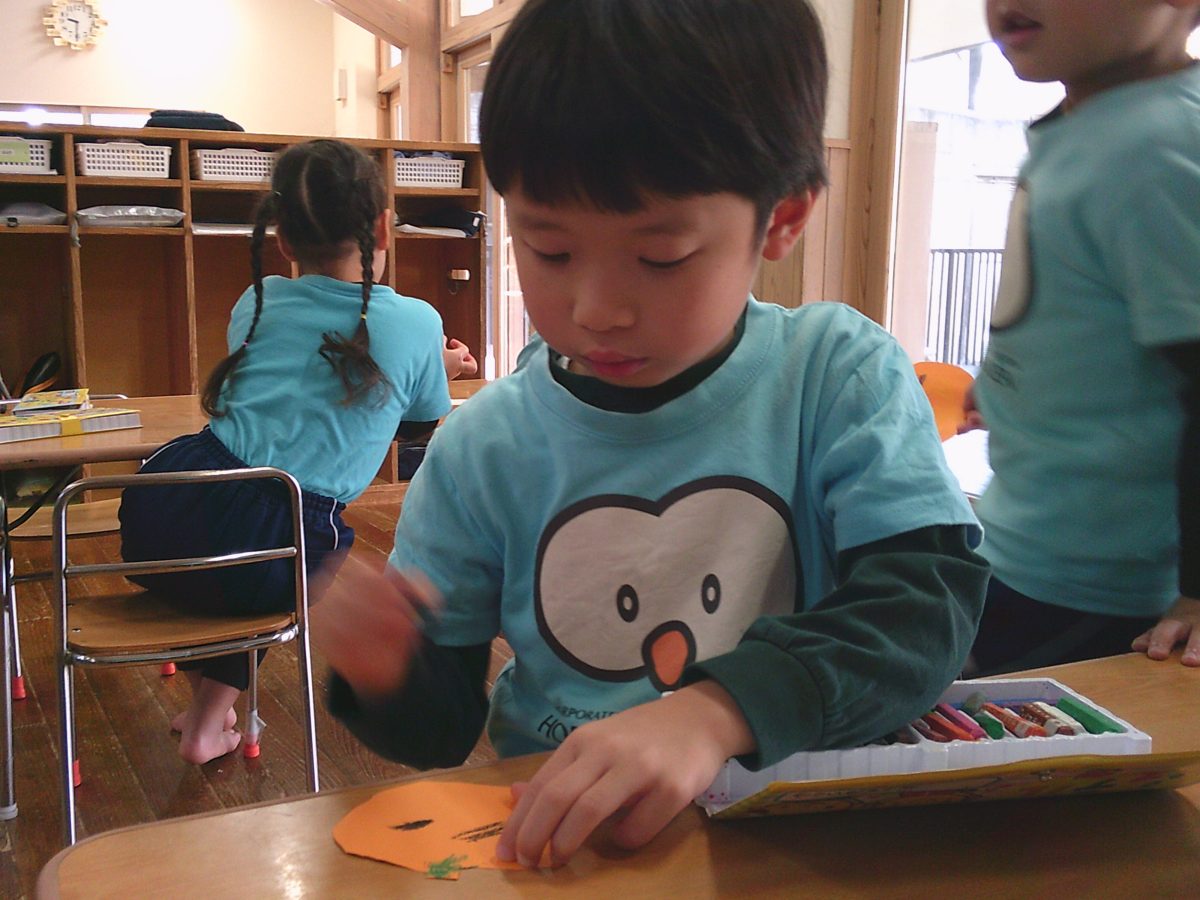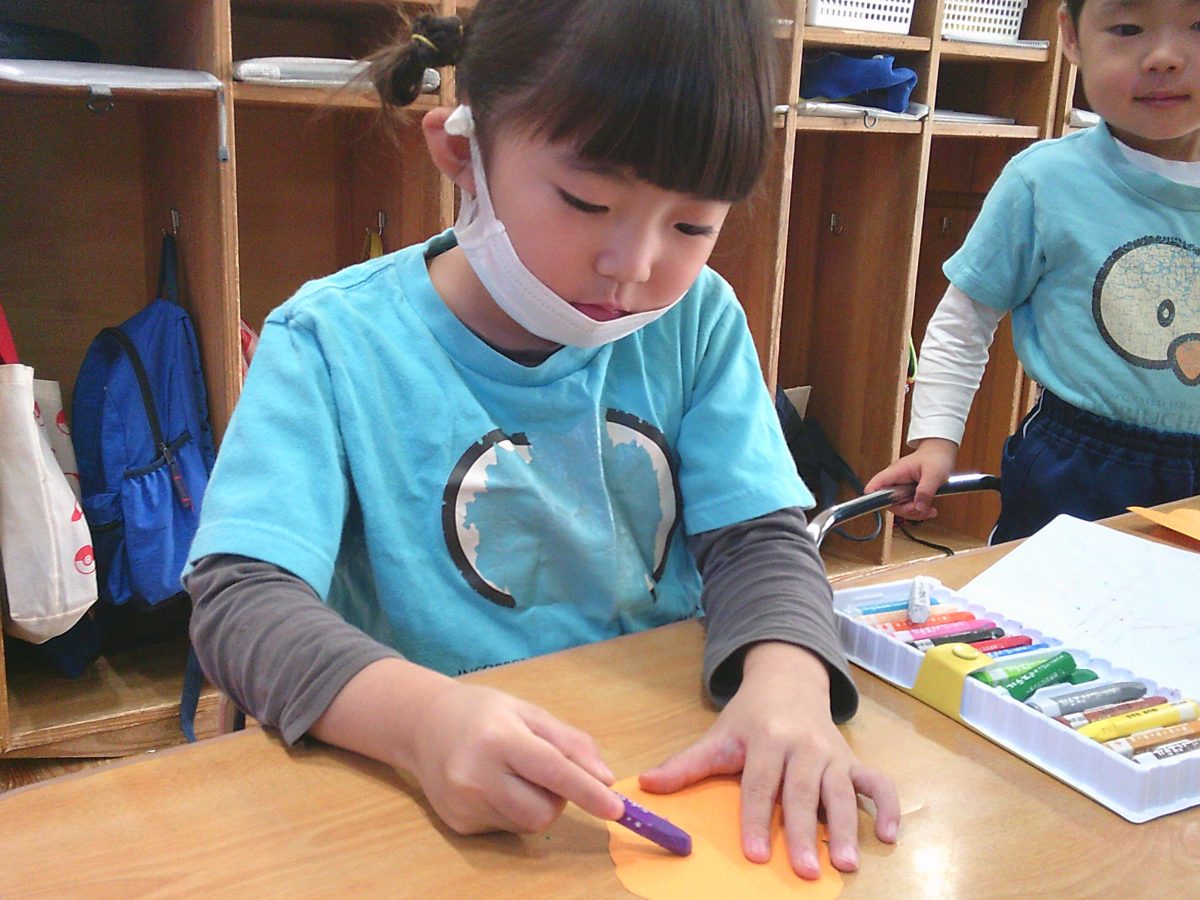 切ったカボチャをクレヨンでお顔を描き、糊を塗って完成🫑🎃✨