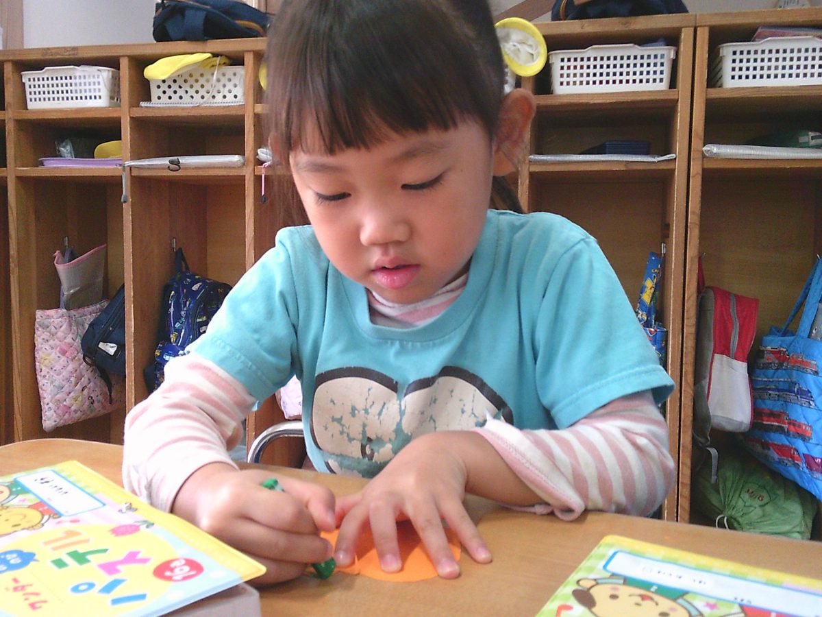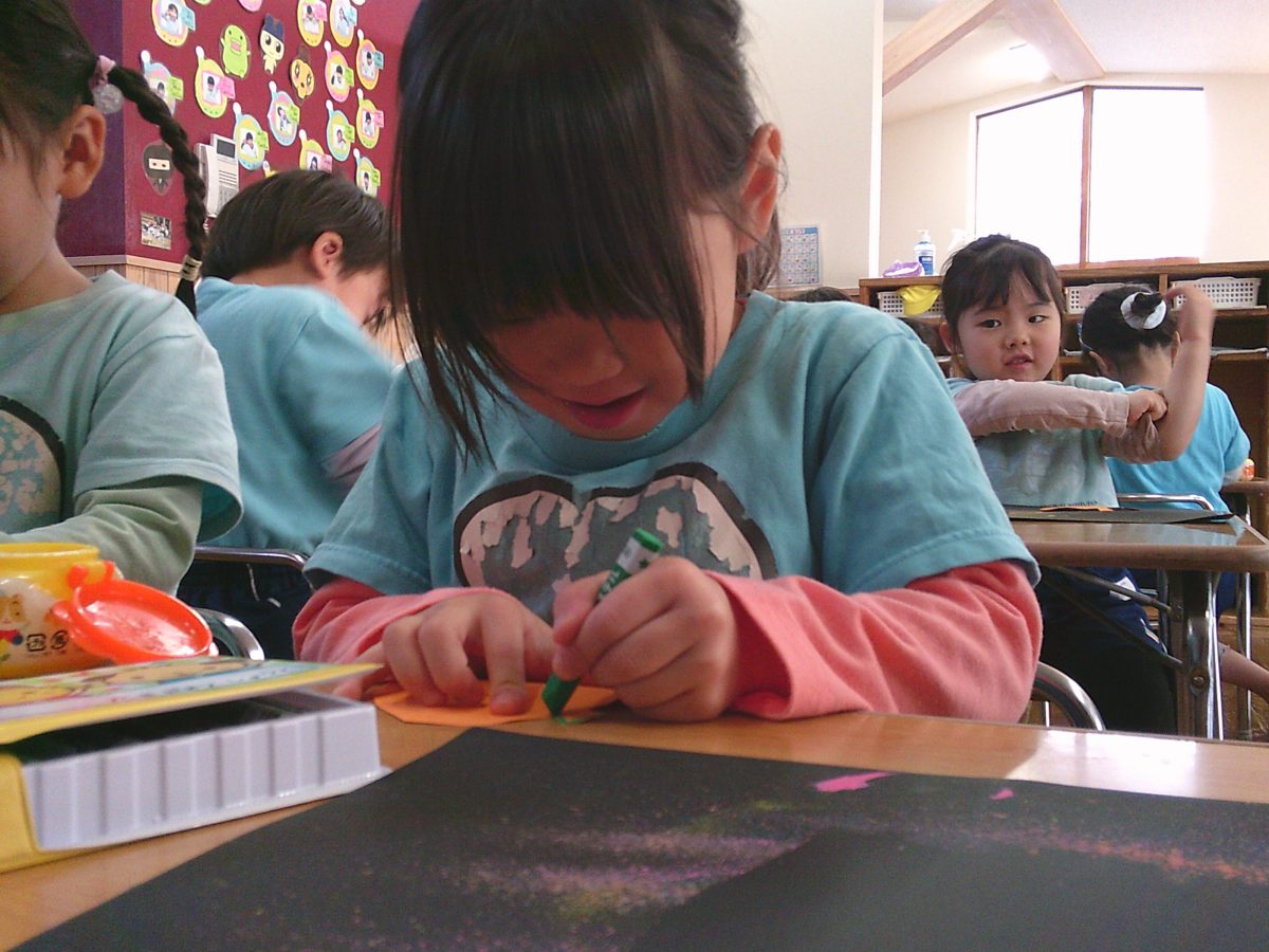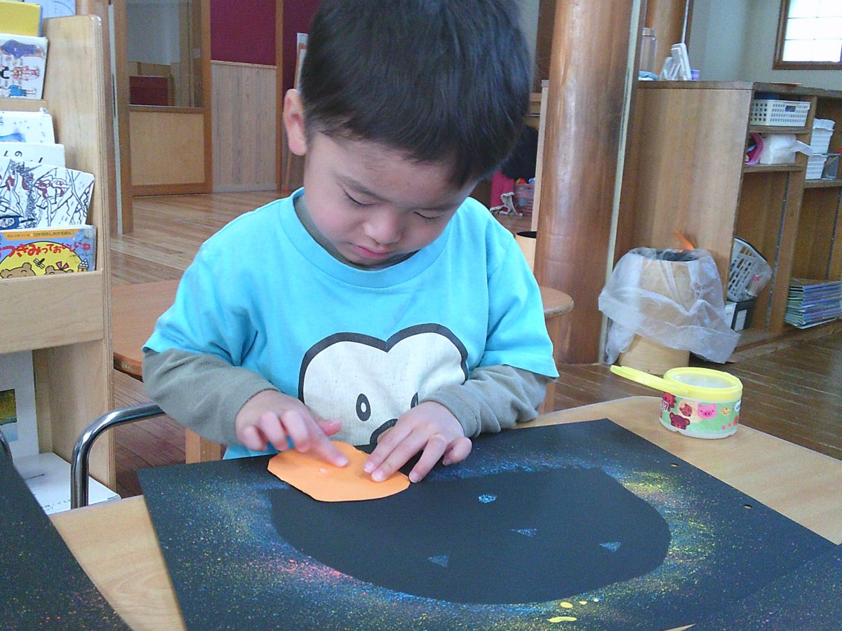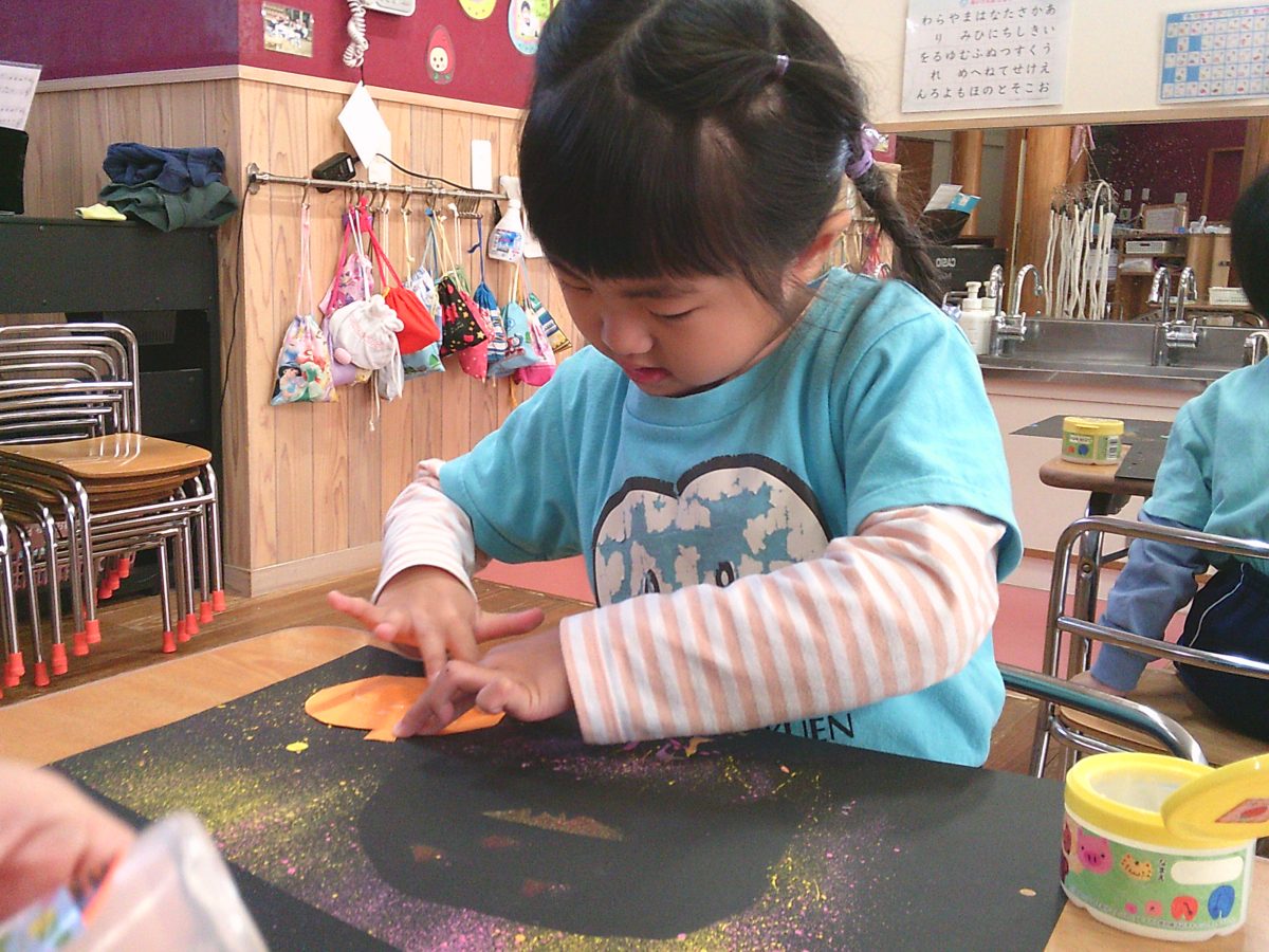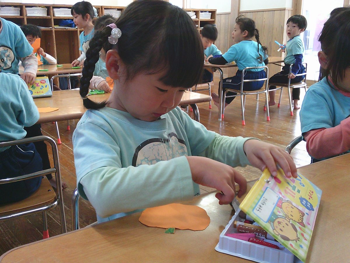 切ったカボチャをクレヨンでお顔を描き、糊を塗って完成🫑🎃✨