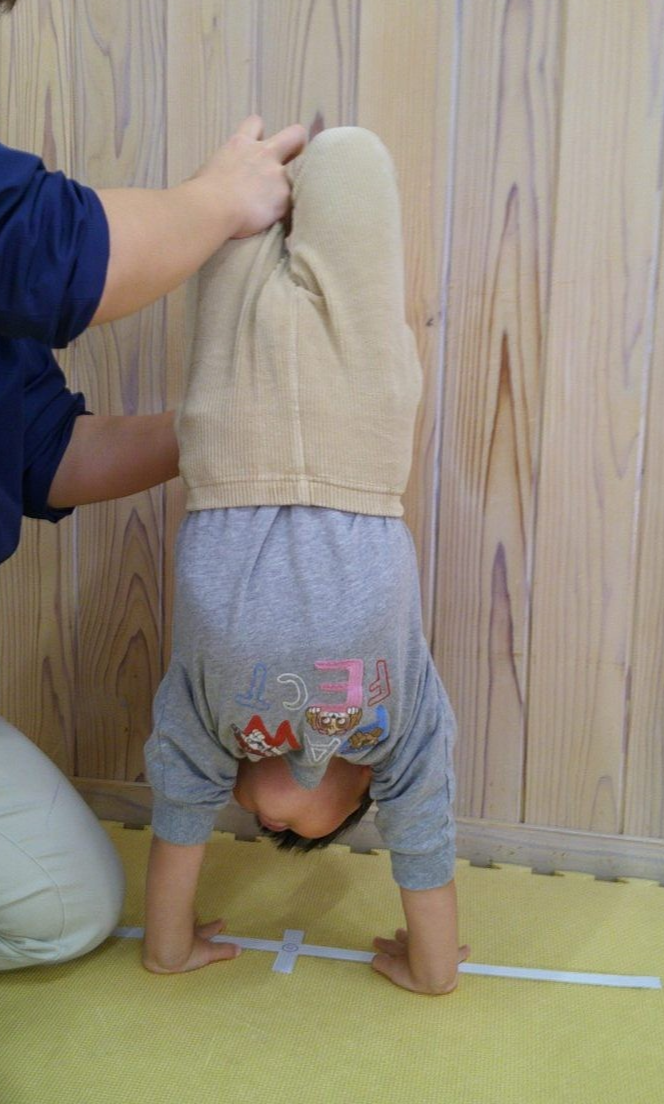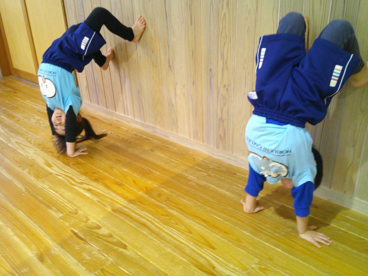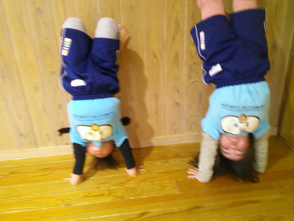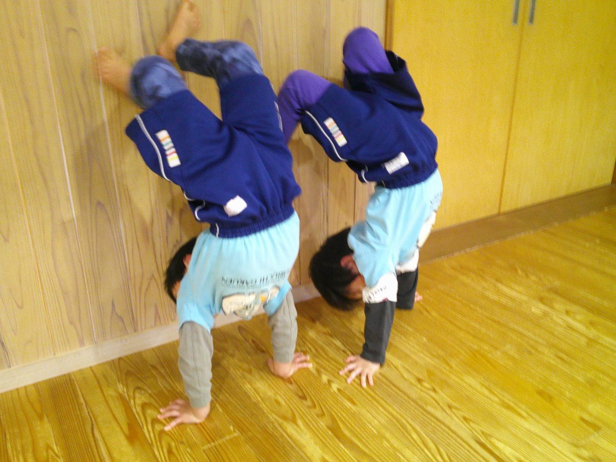 一生懸命に逆立ち歩きの練習をしているお友だちが一緒のタイミングでゴロンッ💨