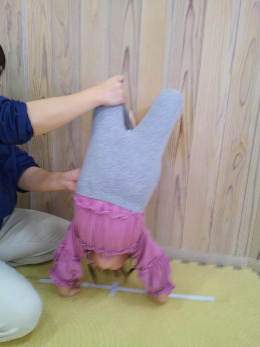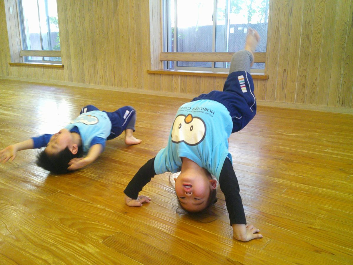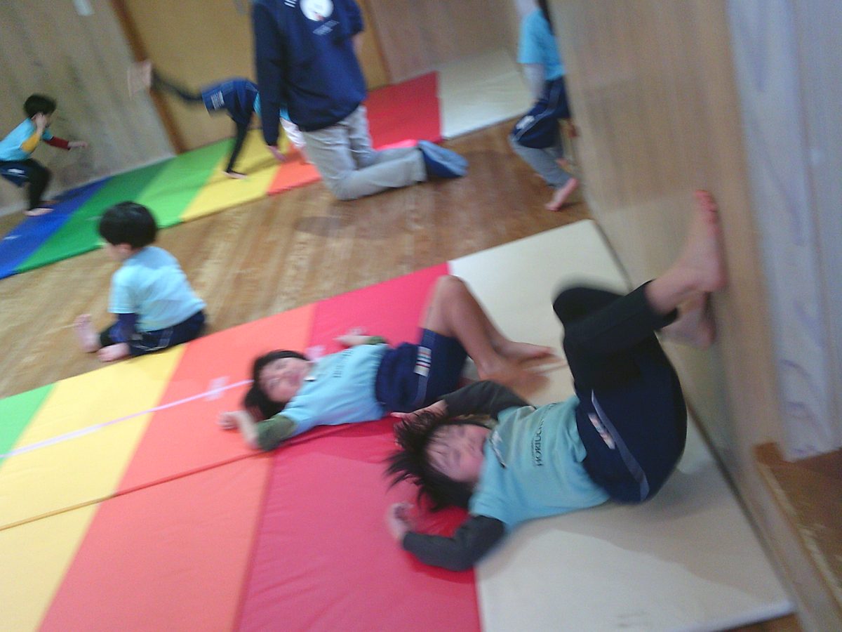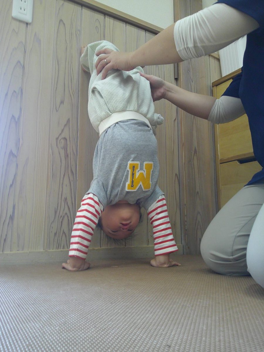 一生懸命に逆立ち歩きの練習をしているお友だちが一緒のタイミングでゴロンッ💨