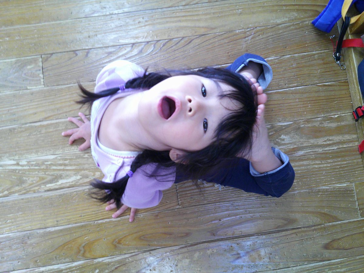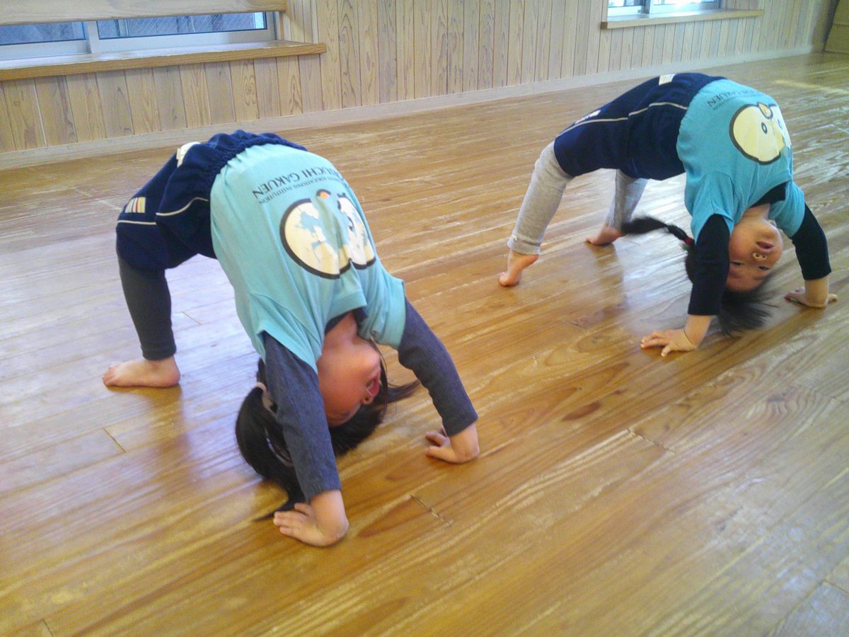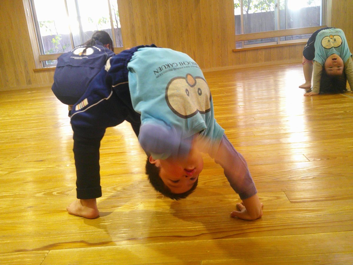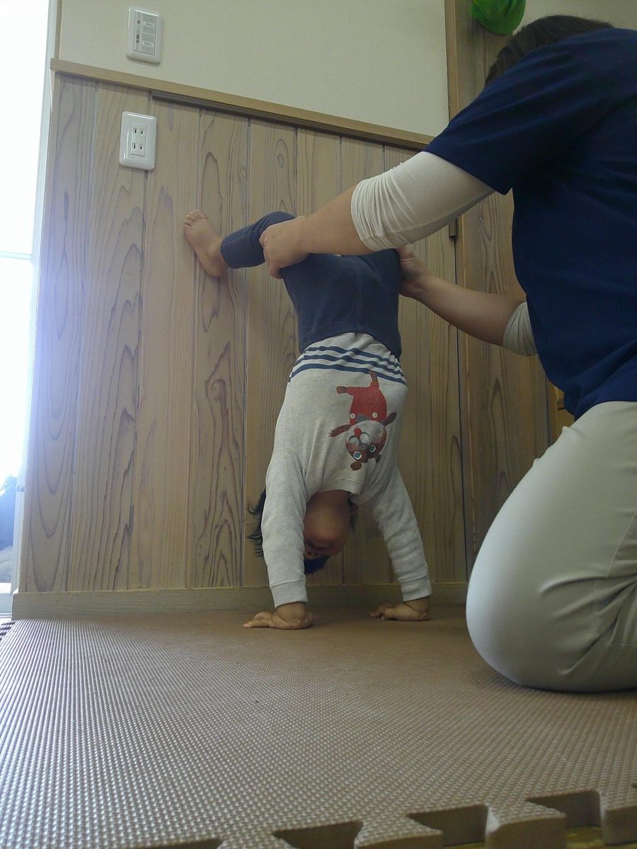 一生懸命に逆立ち歩きの練習をしているお友だちが一緒のタイミングでゴロンッ💨