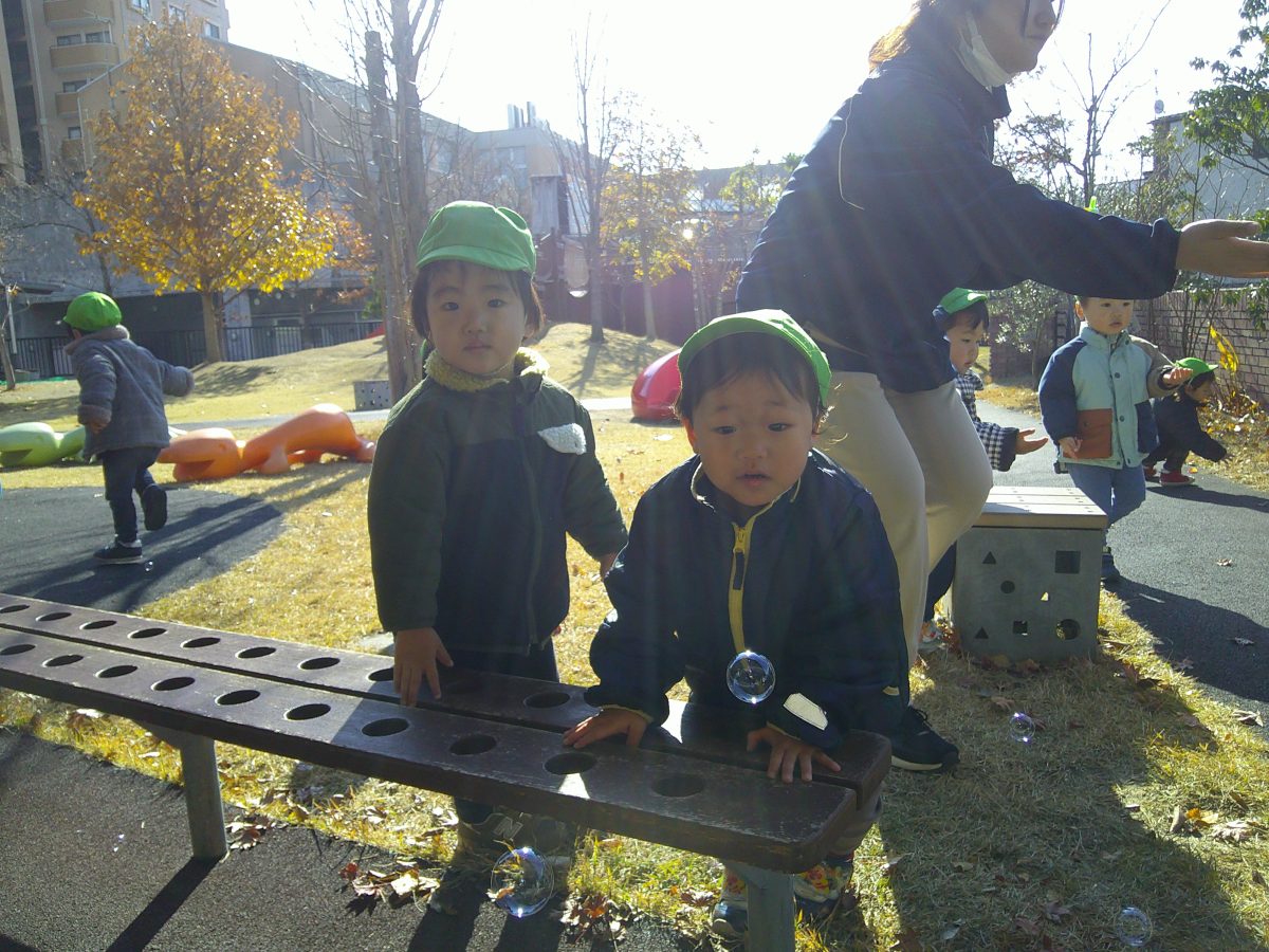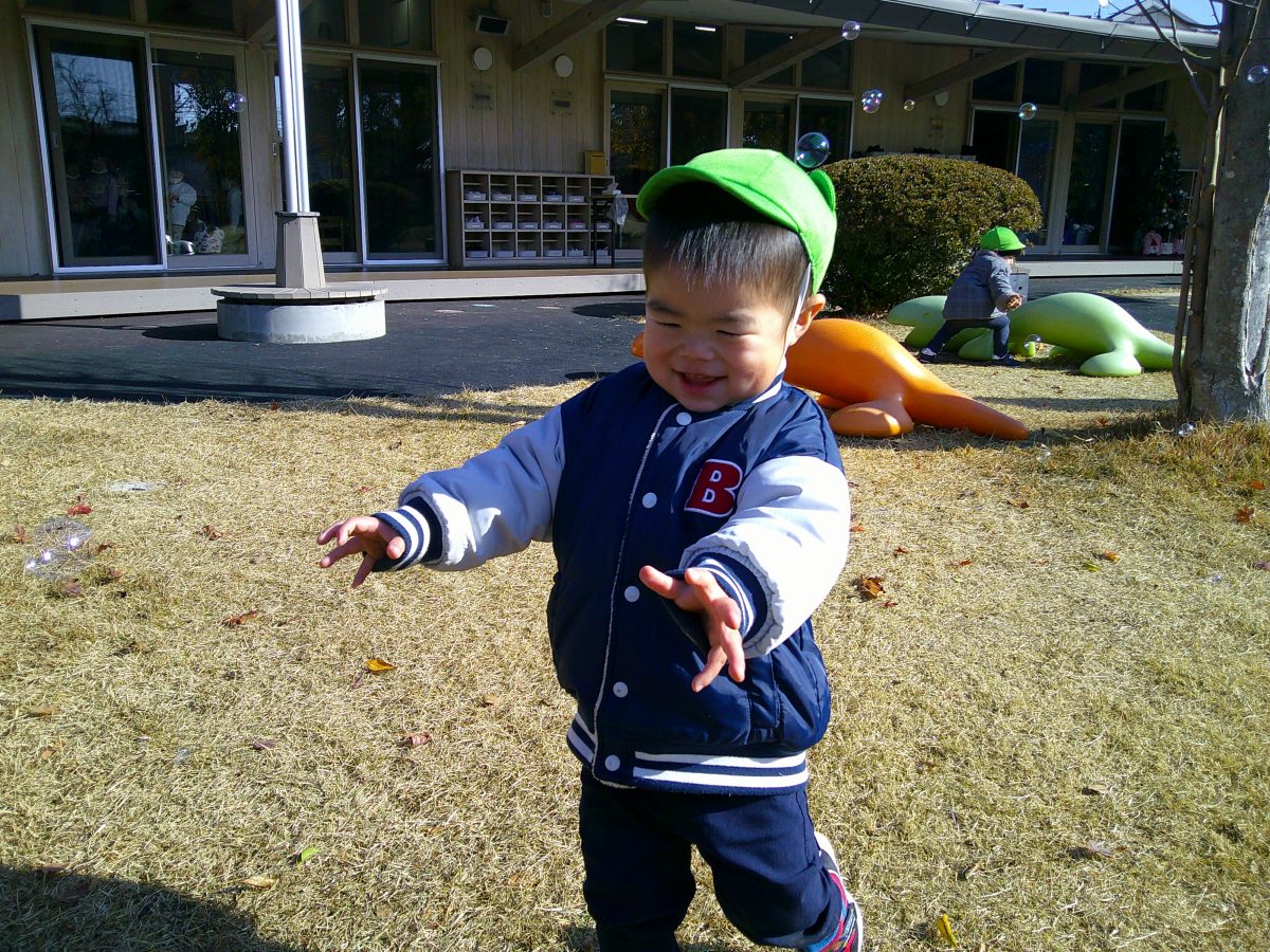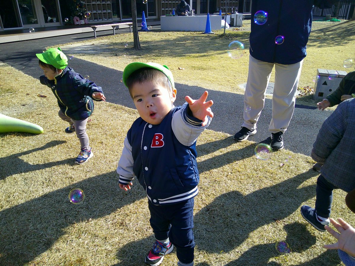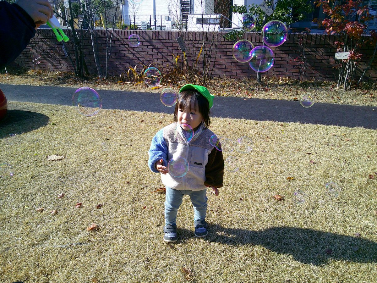 シャボン玉を追いかけたり、砂で顔を作ってみたり(!?)