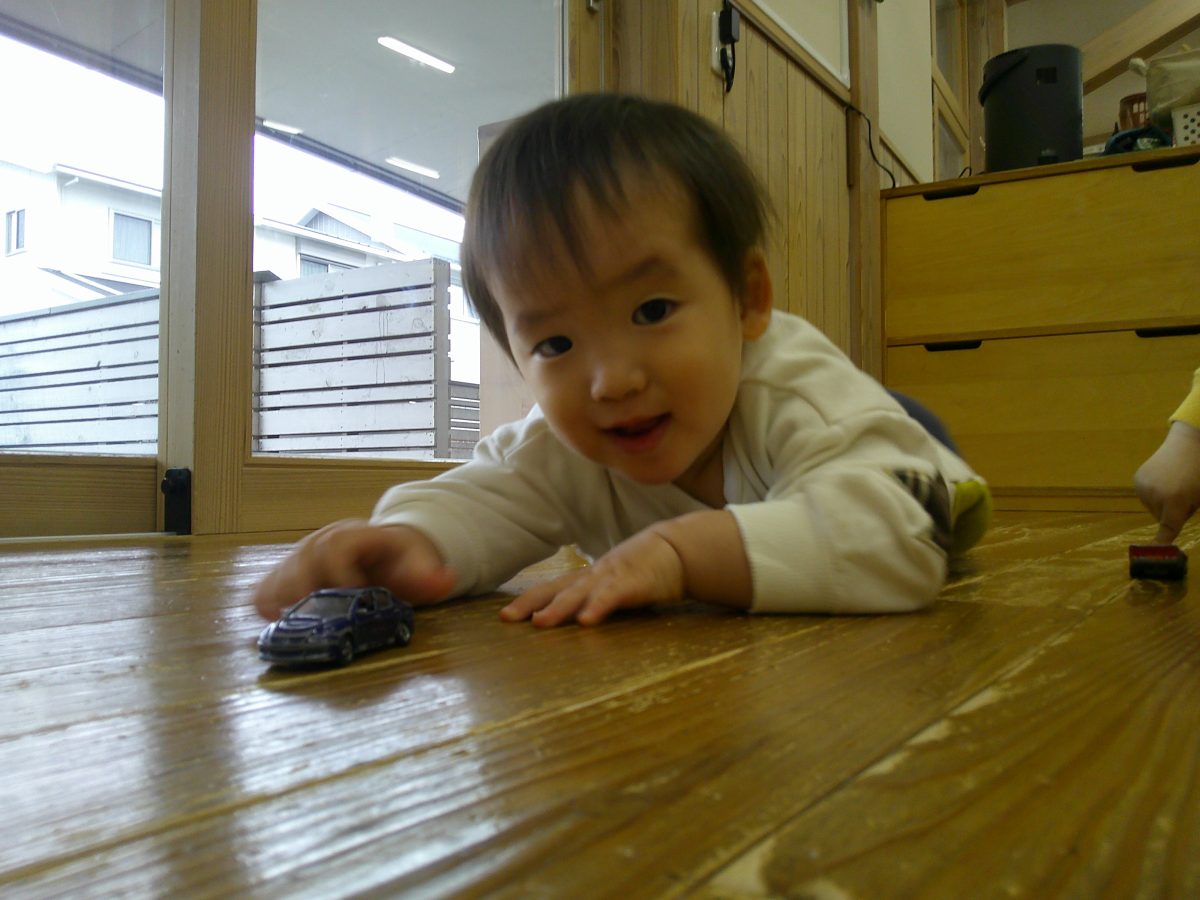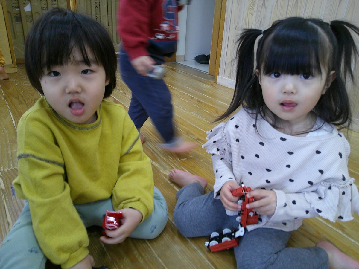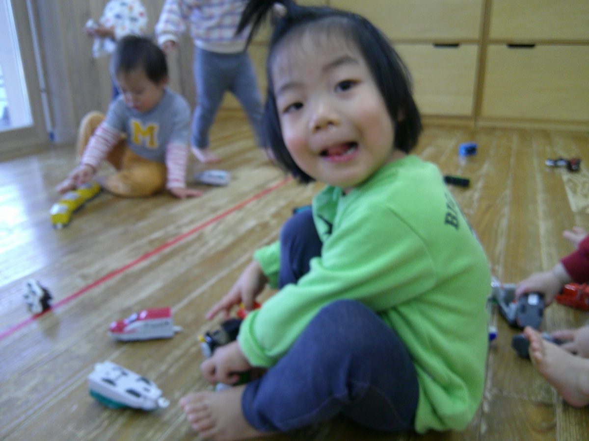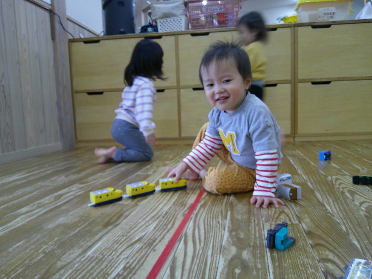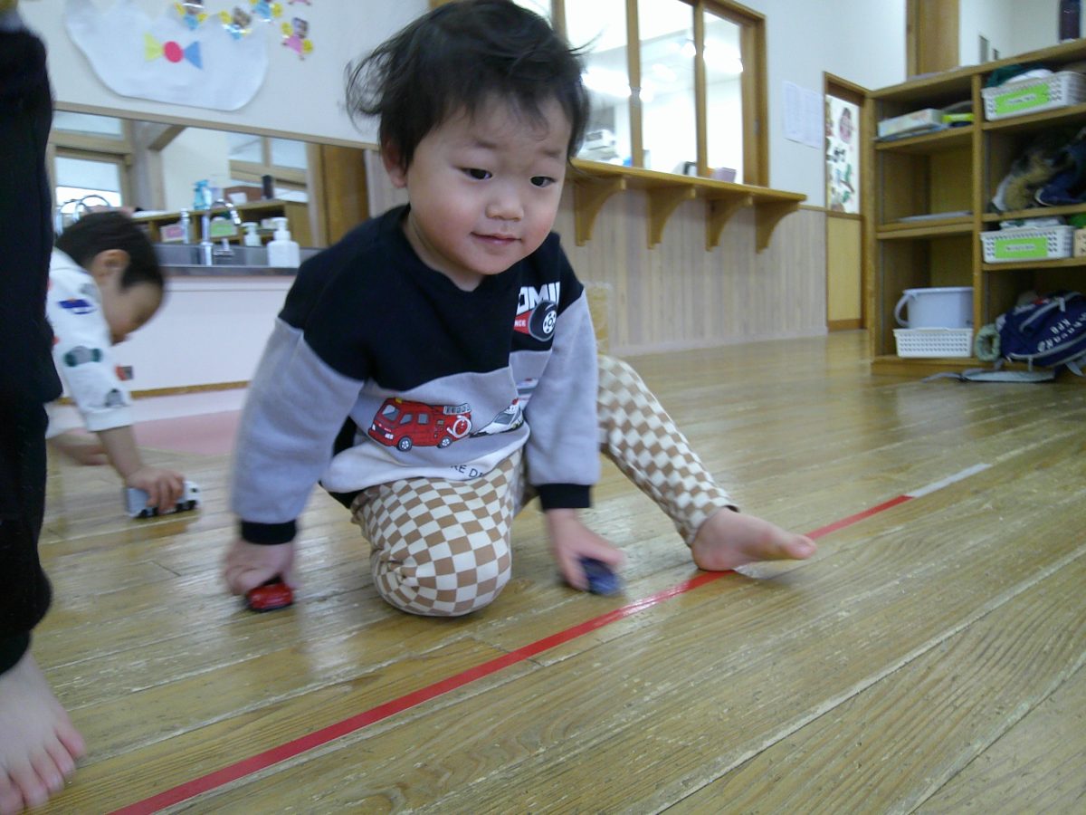 お部屋に戻ってからは車や電車のおもちゃで遊びました🎵おしりを上げて車を走らせたり、寝転んで車を走らせたりして楽しんでいました🚗
