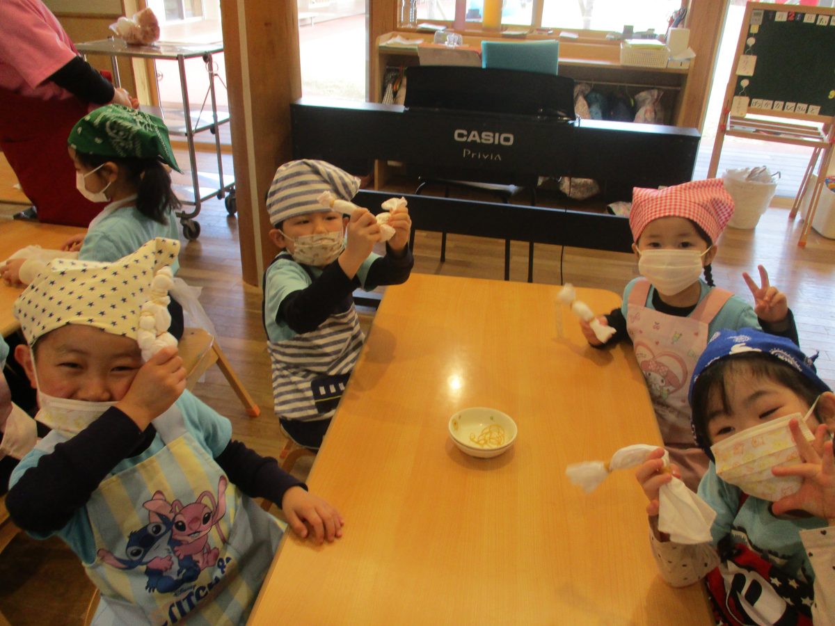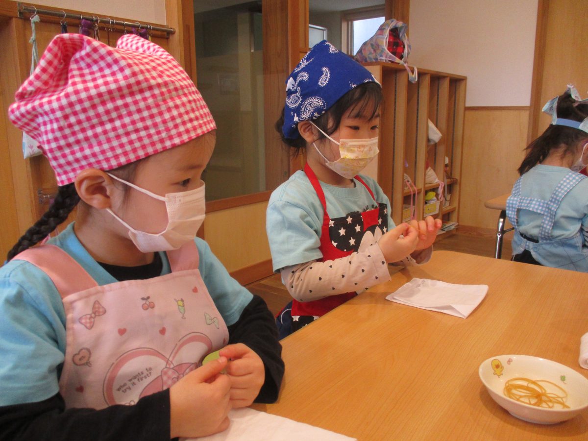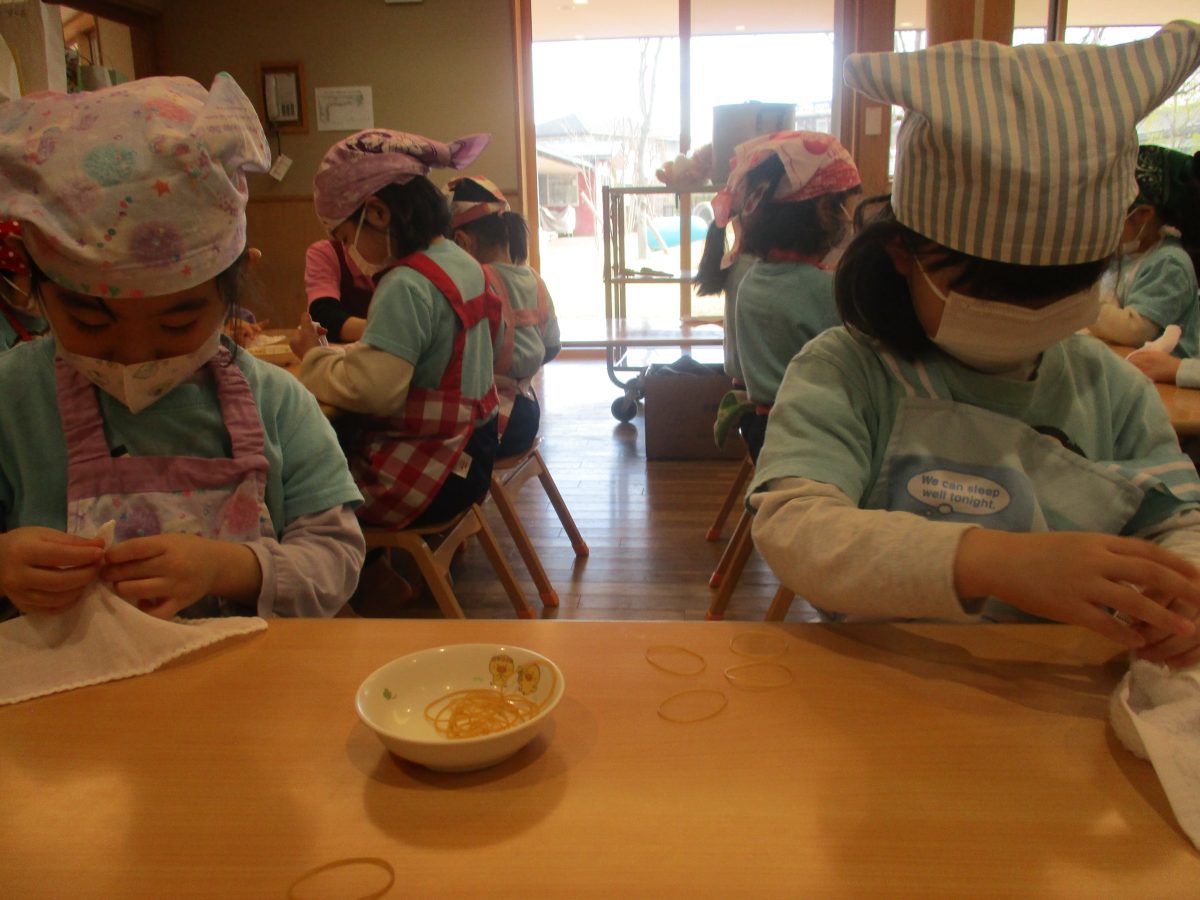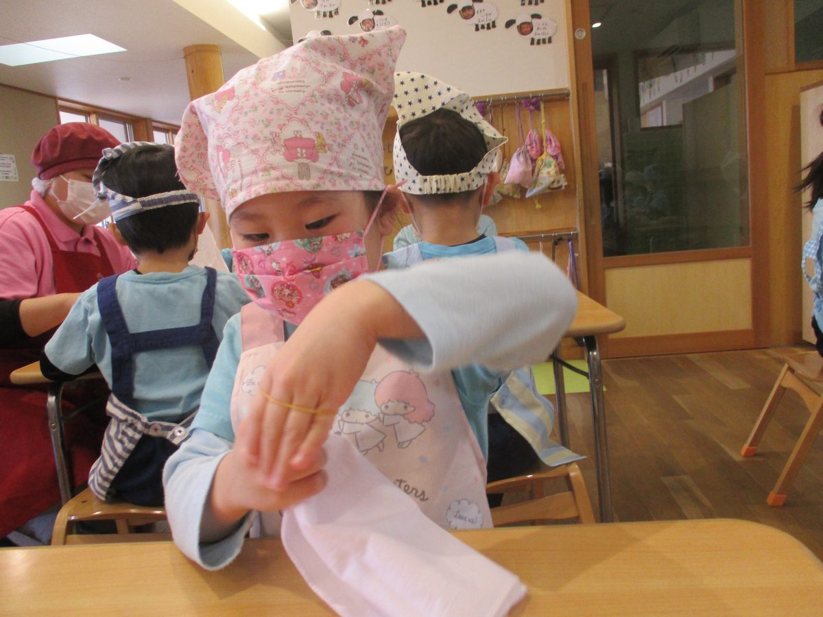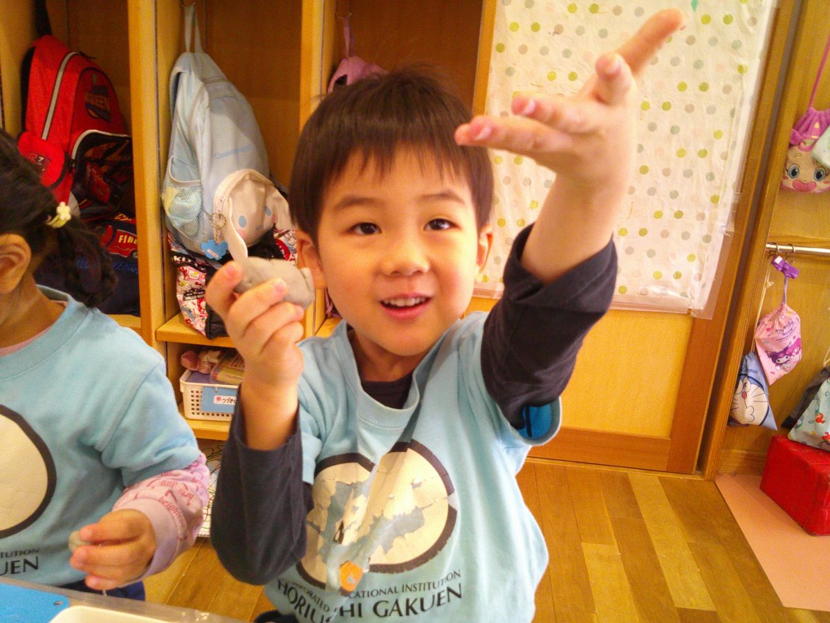 最初は、自分の指に輪ゴムを巻いてみよう!!苦戦しながらも頑張っていましたよ👏