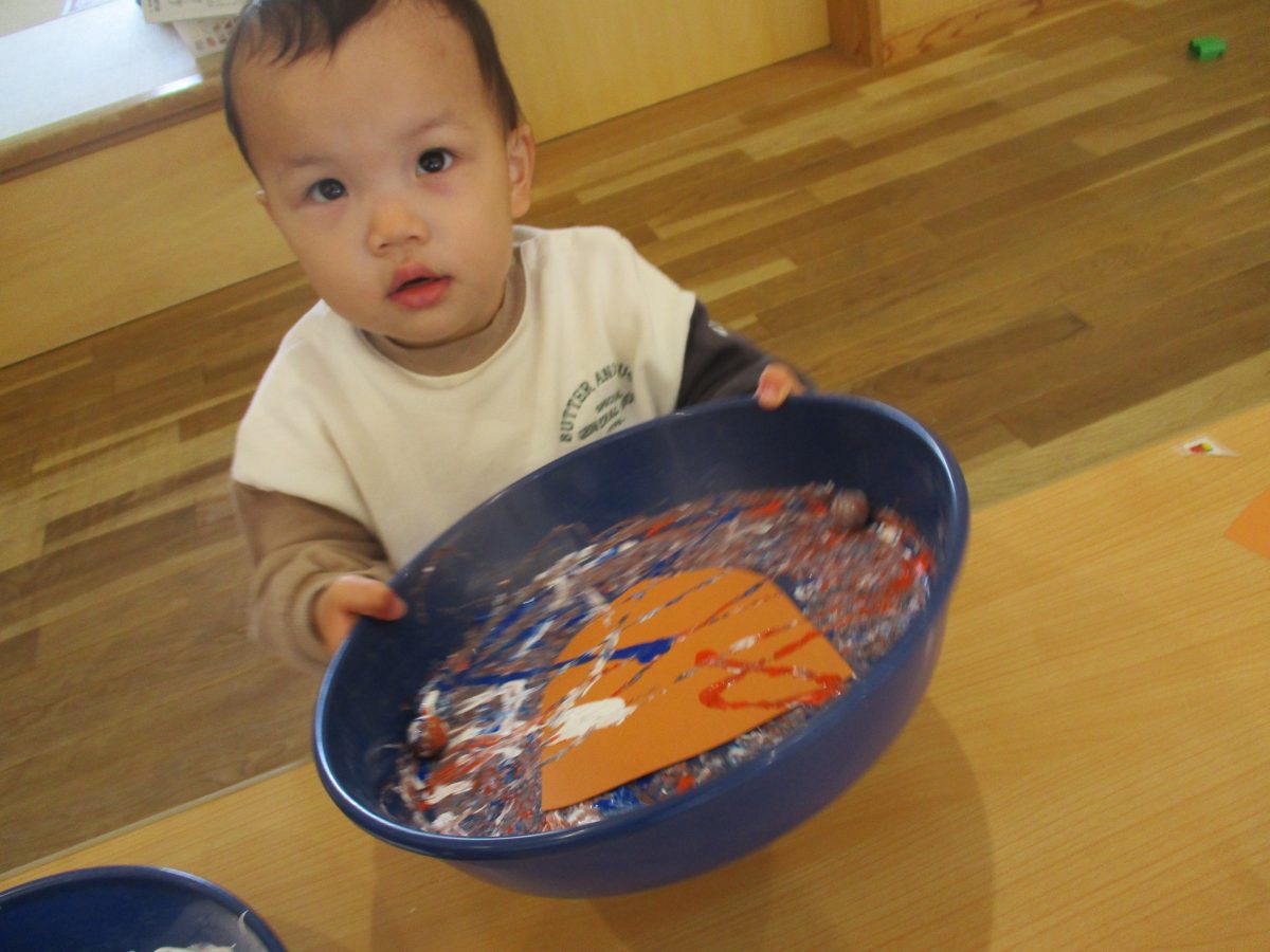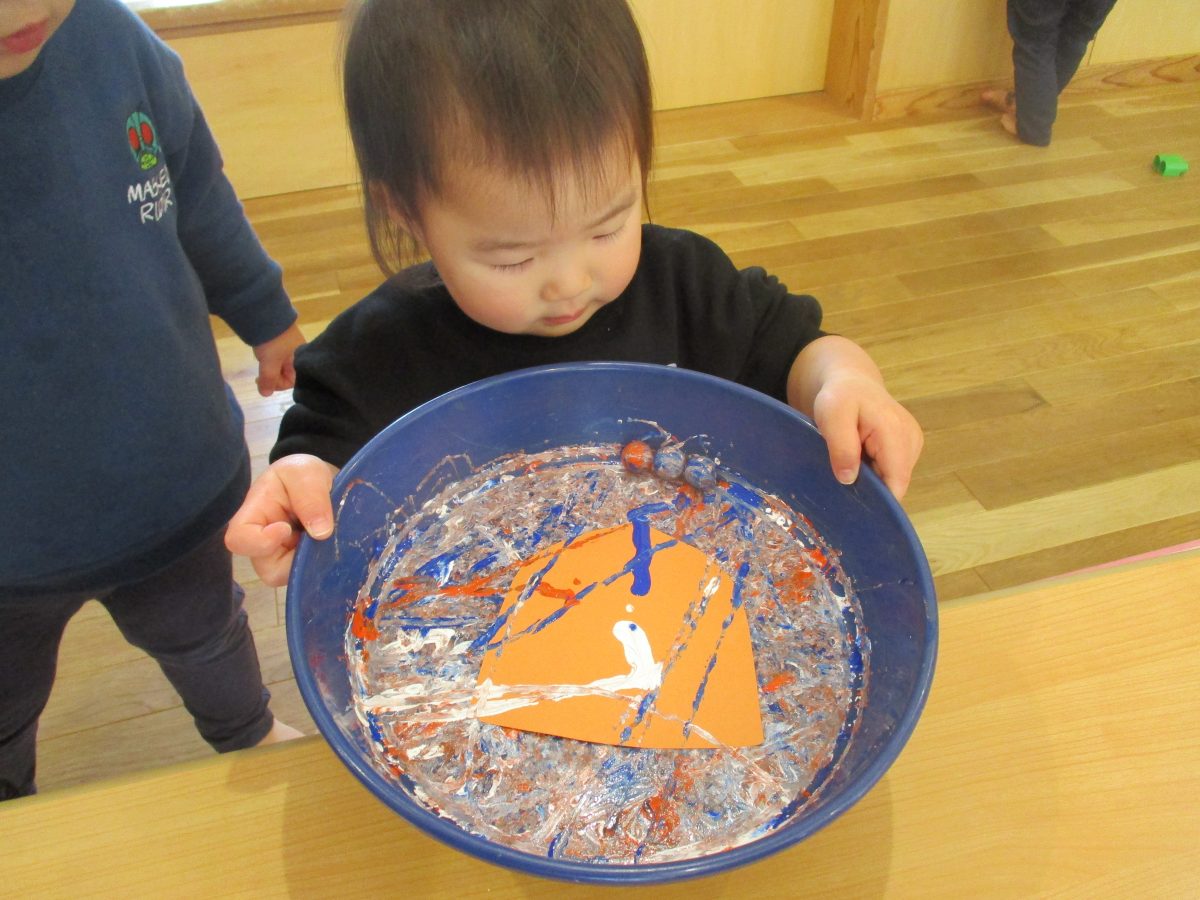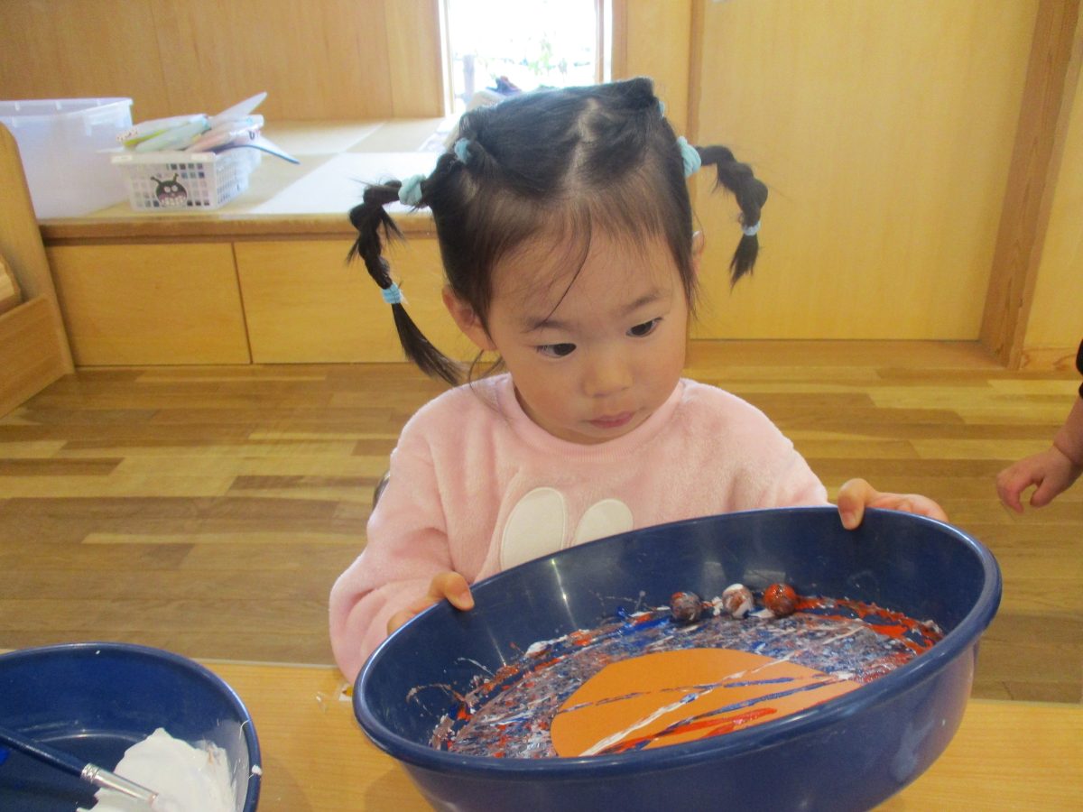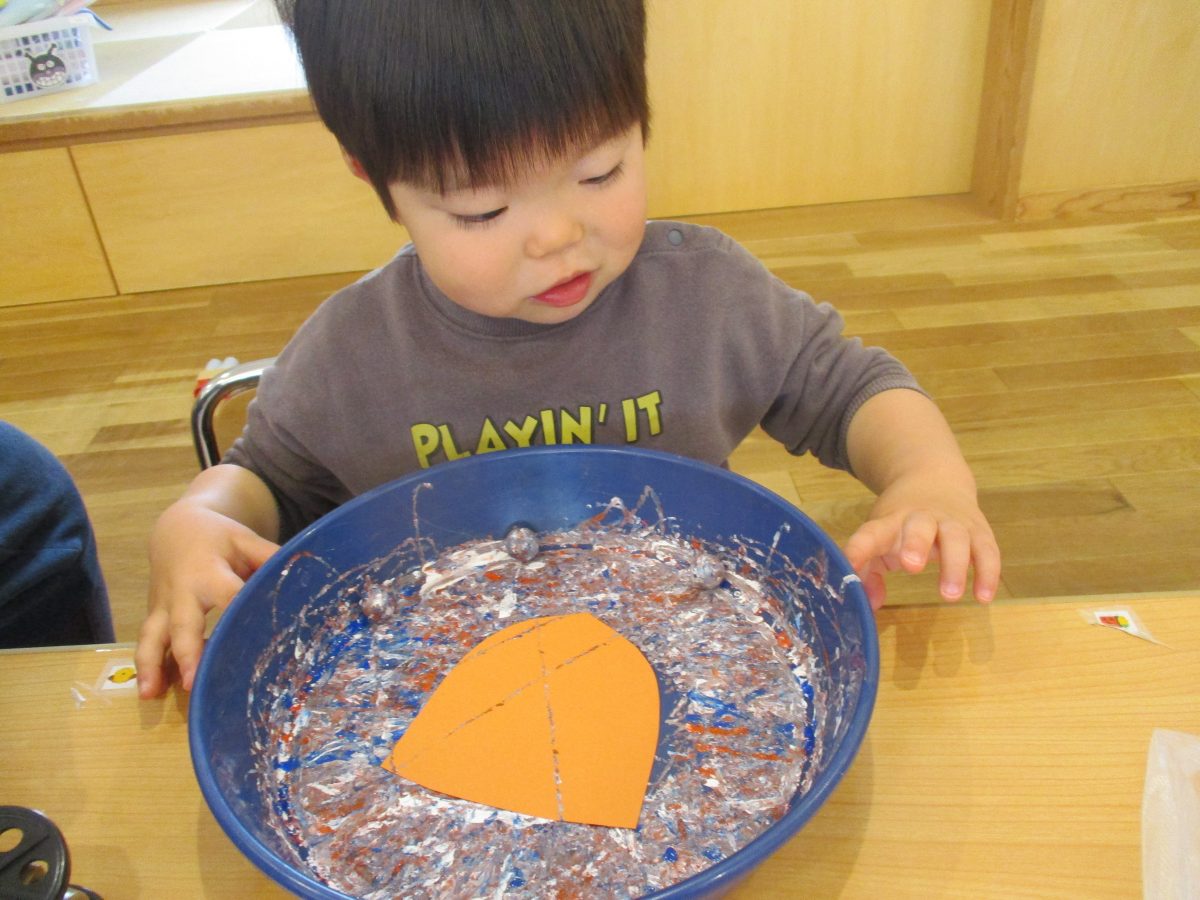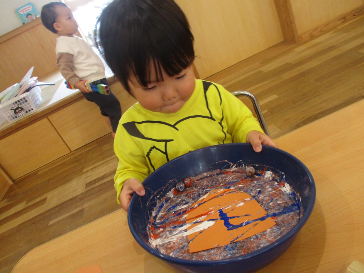 どんぐりの語りの画用紙にコロコロと絵の具のついたビー玉を転がして、