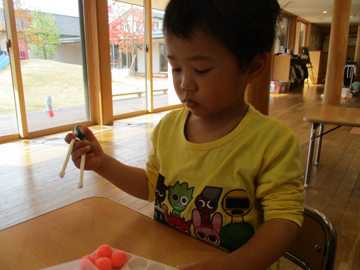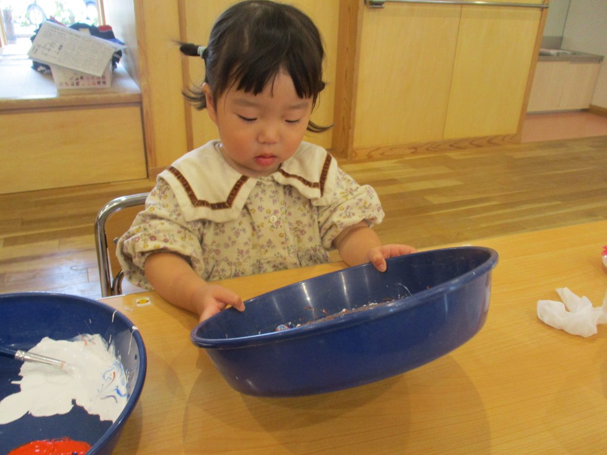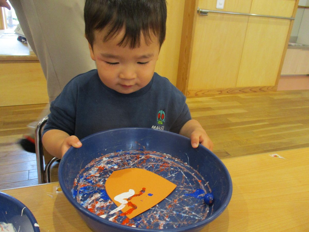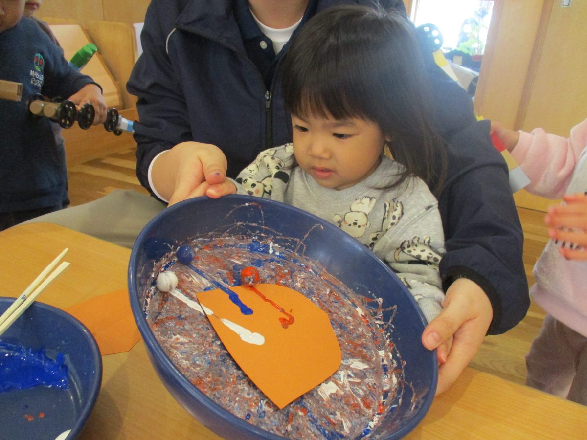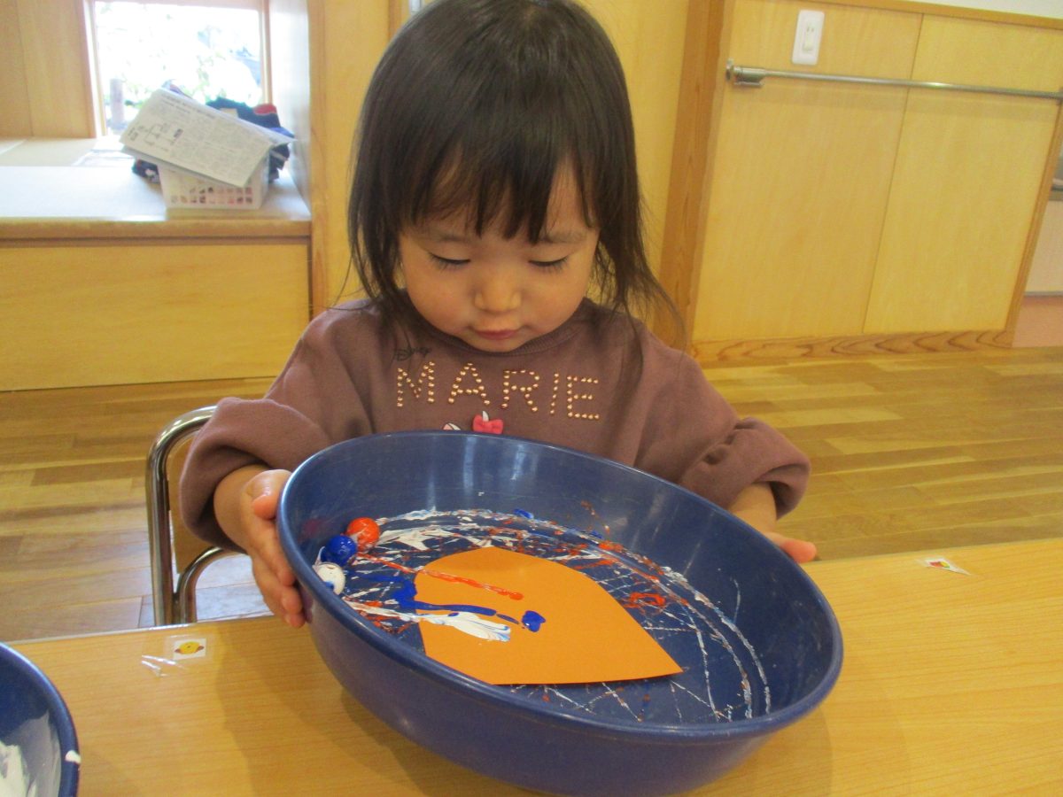 どんぐりの語りの画用紙にコロコロと絵の具のついたビー玉を転がして、