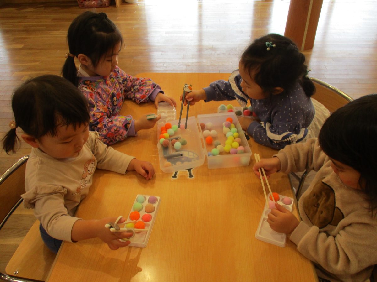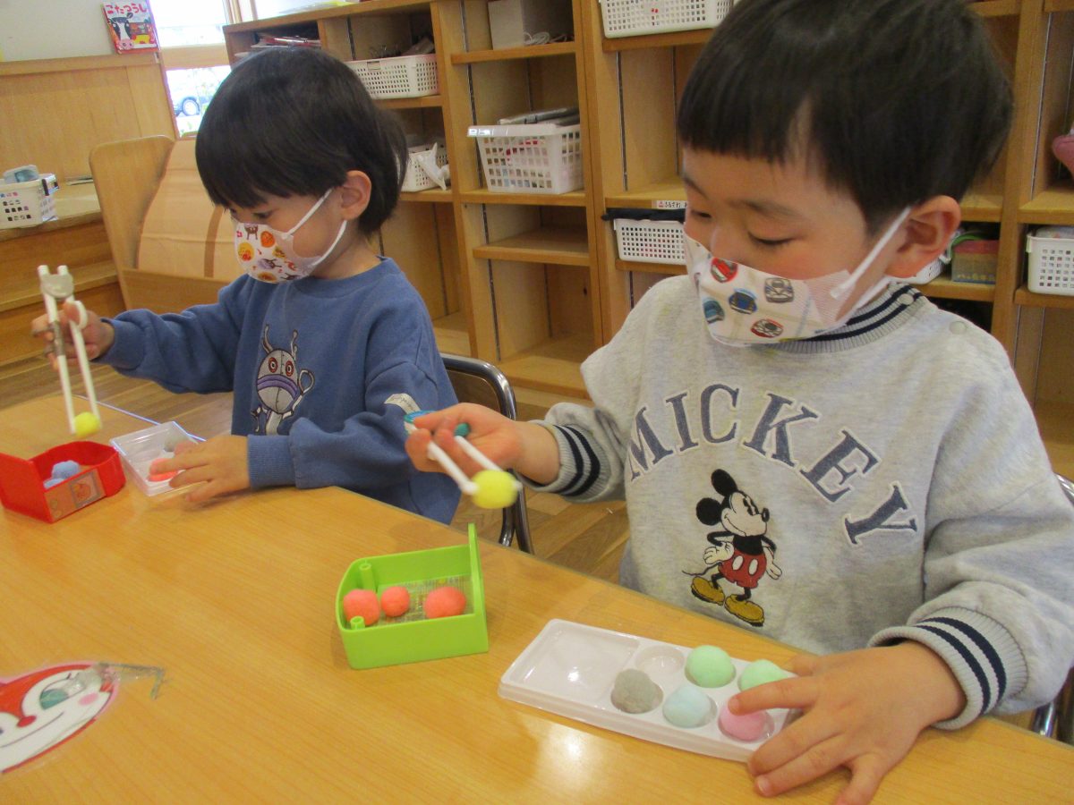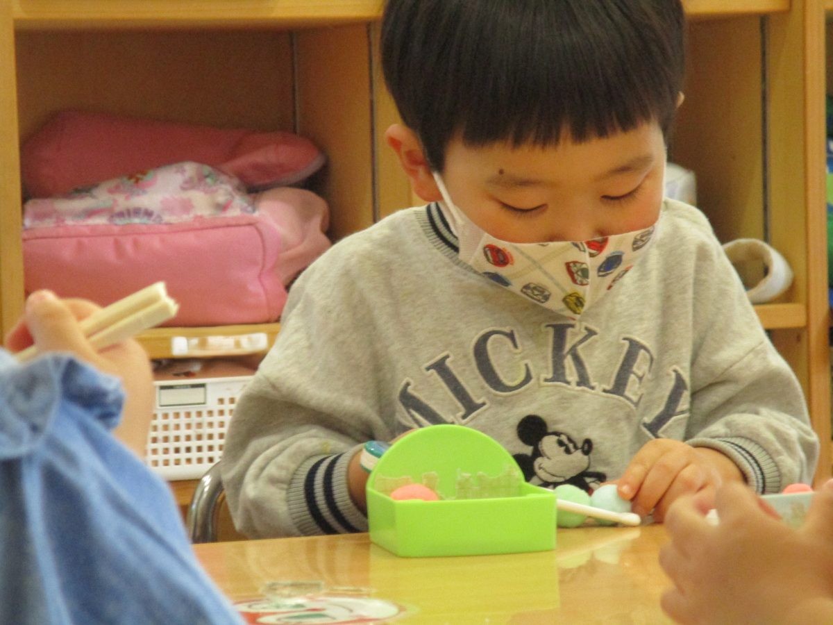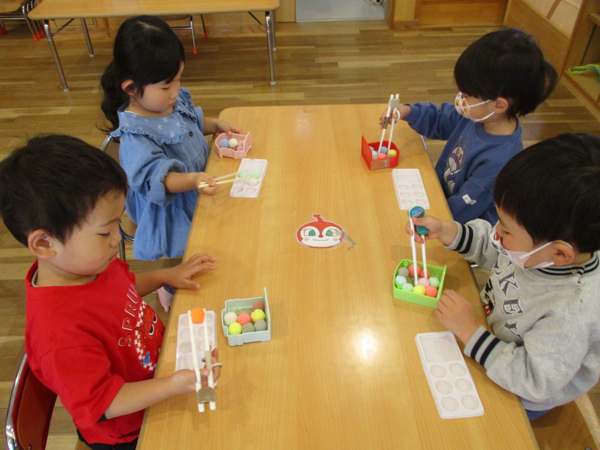 お外で元気に遊んだ後は、お給食の時間まで、お箸の練習です🥢正しい持ち方で持てるかな?🤭