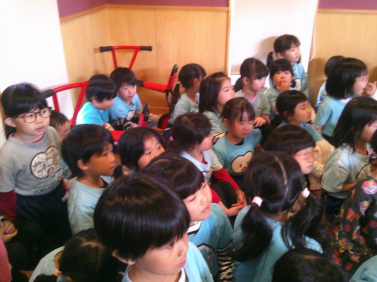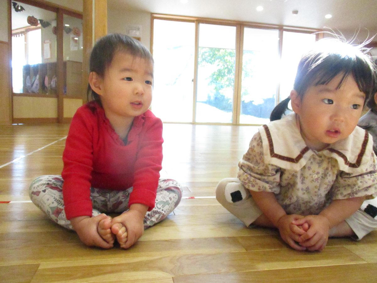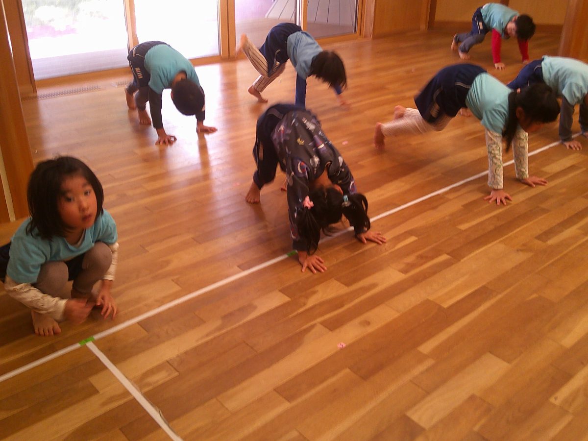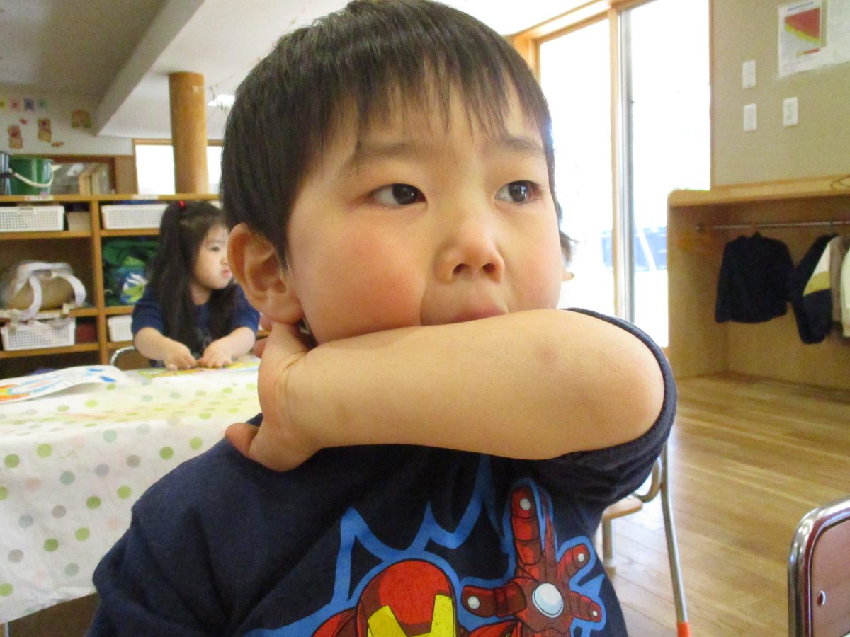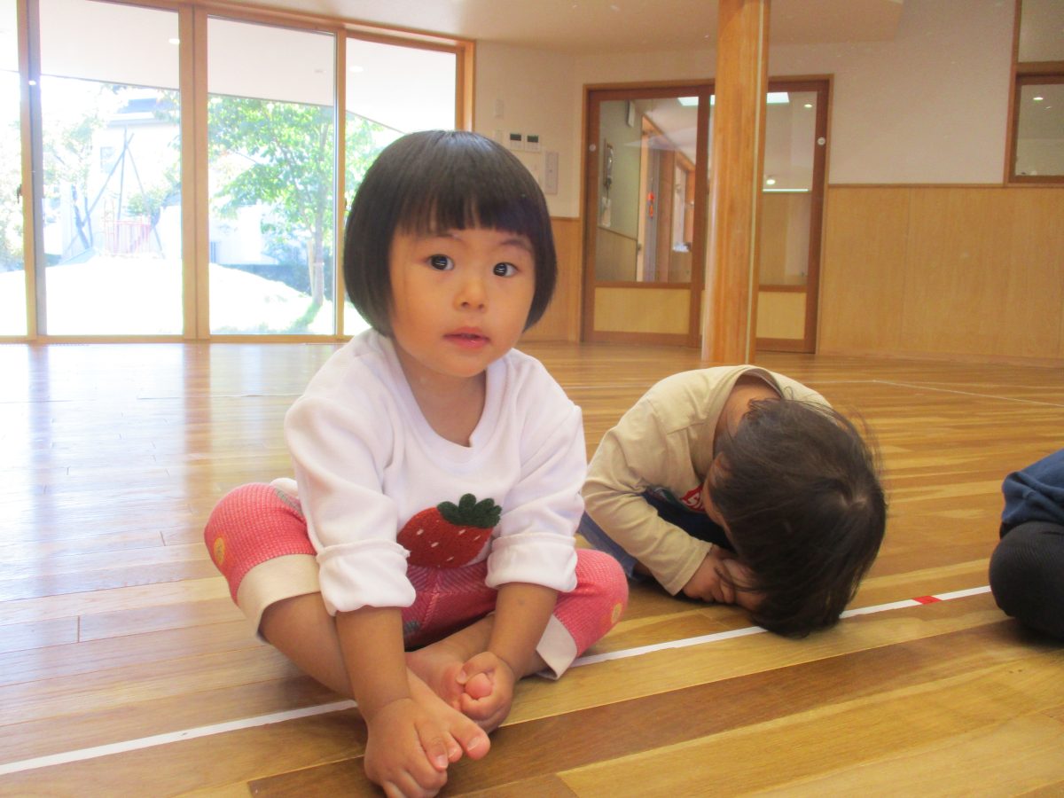 今日は、不審者対応の避難訓練がありました。ホールでジッと待ちます。