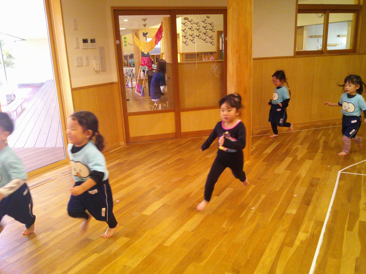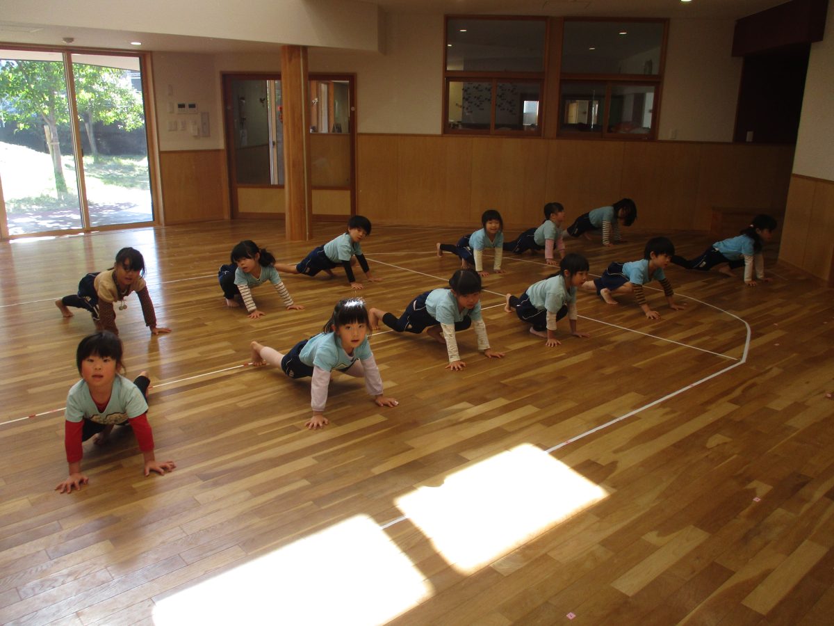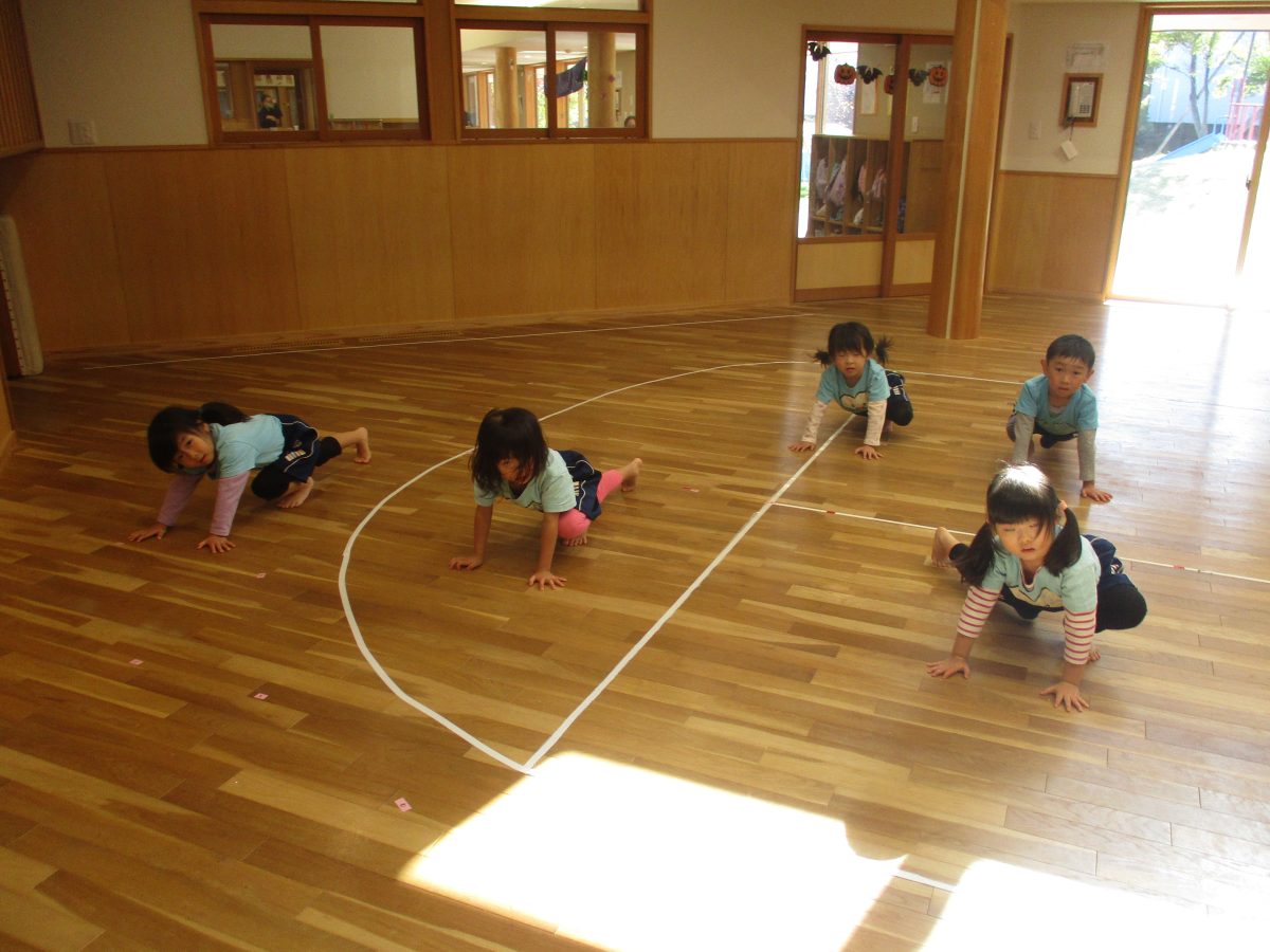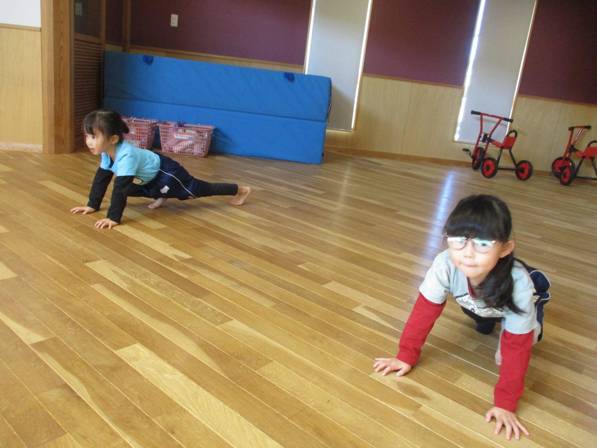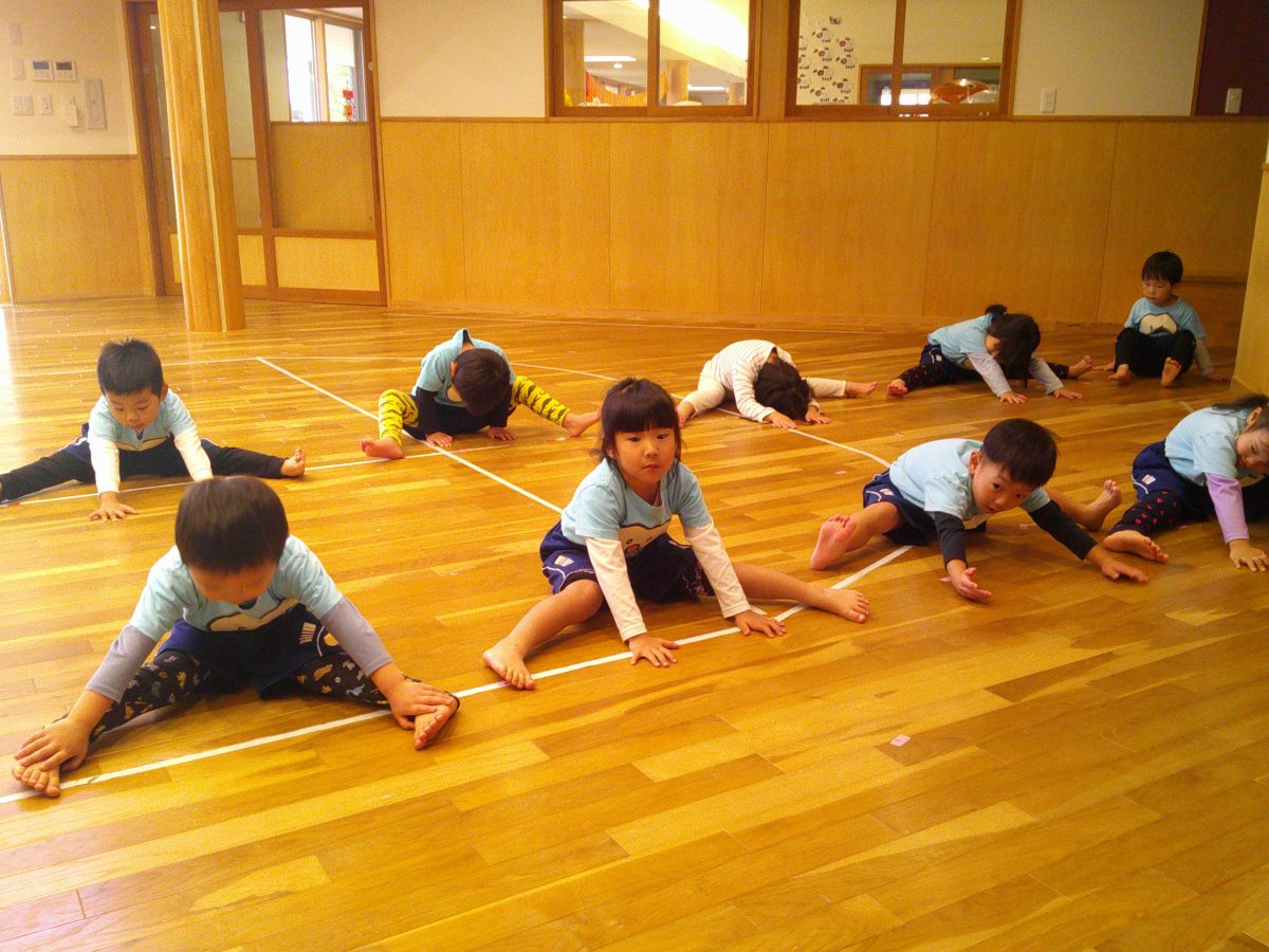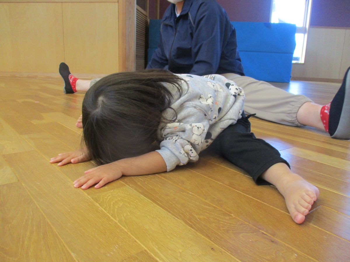 今日は、不審者対応の避難訓練がありました。ホールでジッと待ちます。