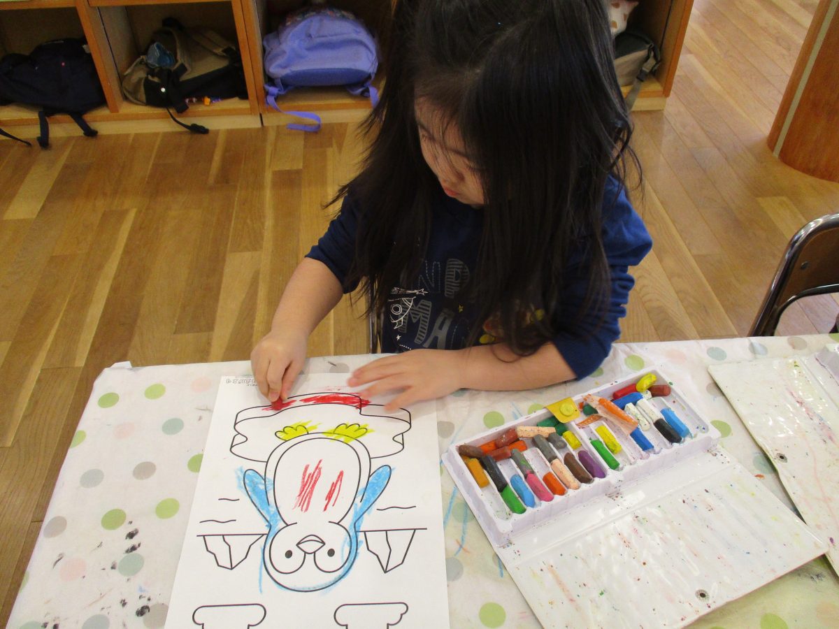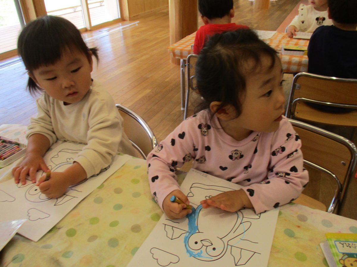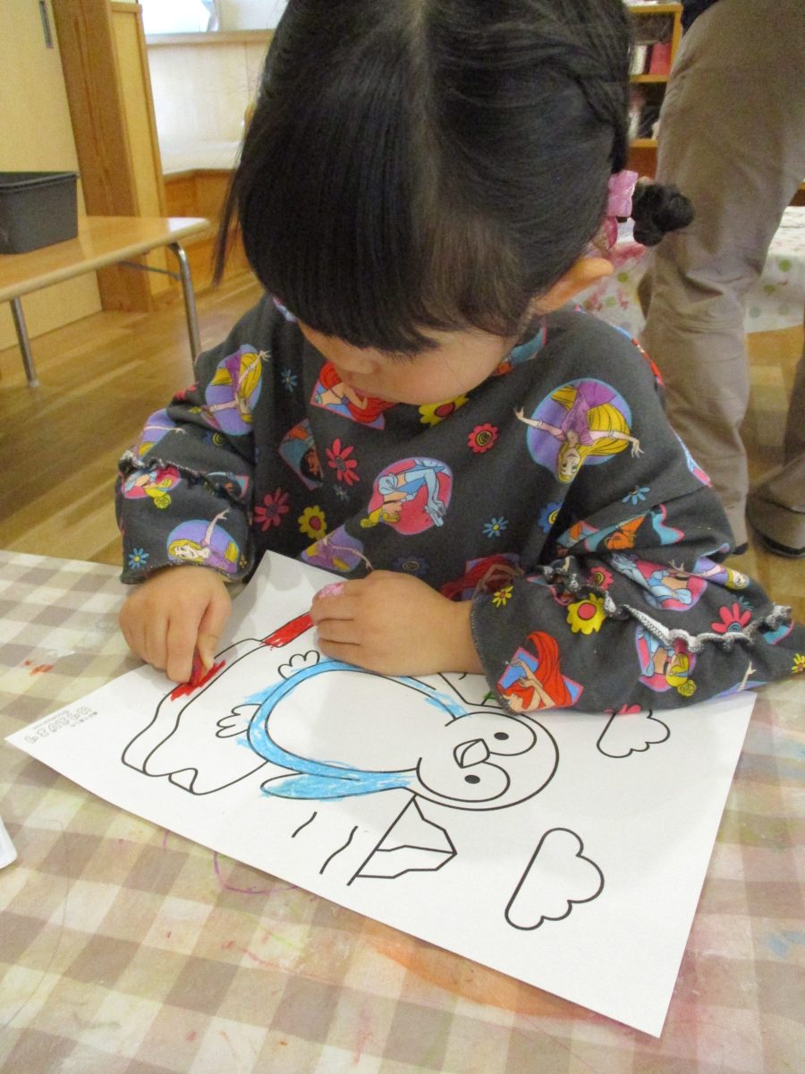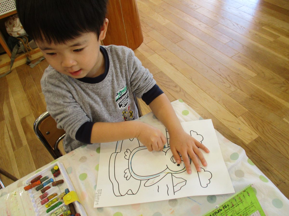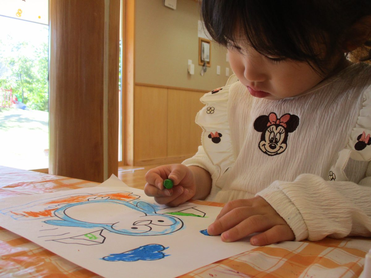 今日は不審者を想定した避難訓練がありました!こわ~い不審者さんが来るまで、お部屋でぬり絵をして過ごしました!見本と同じ色で塗れるかな?🖍️