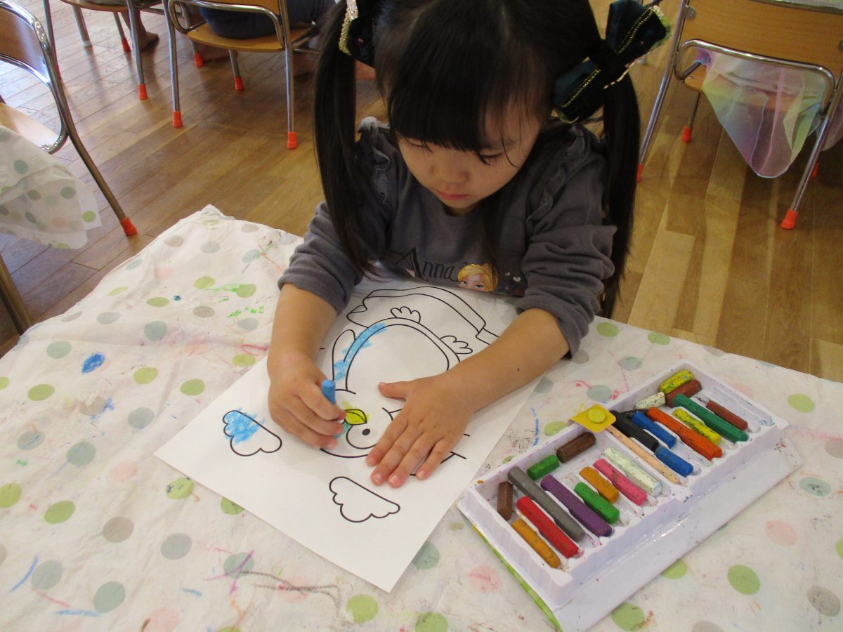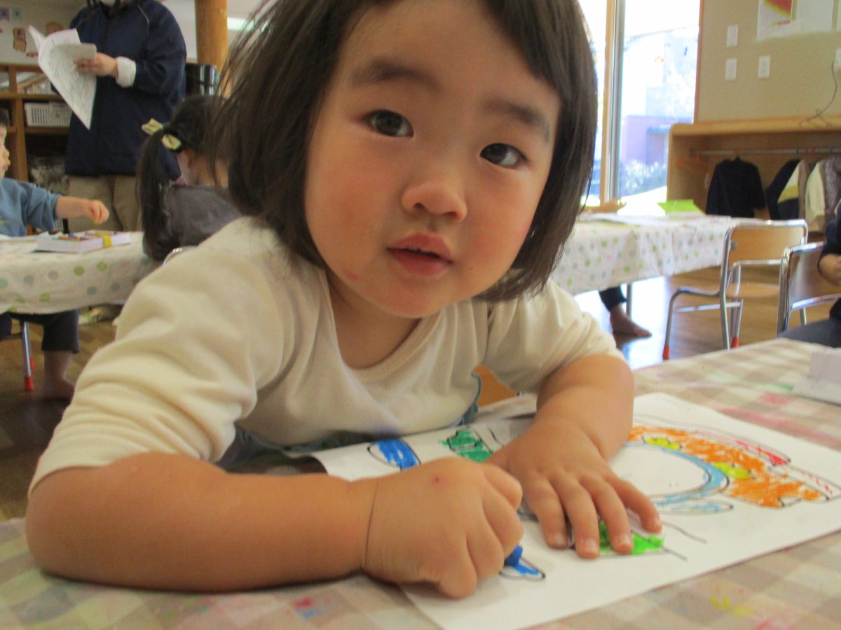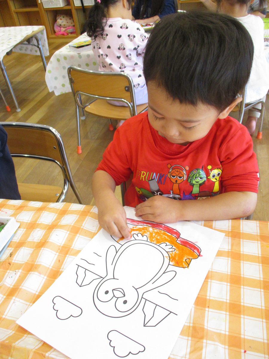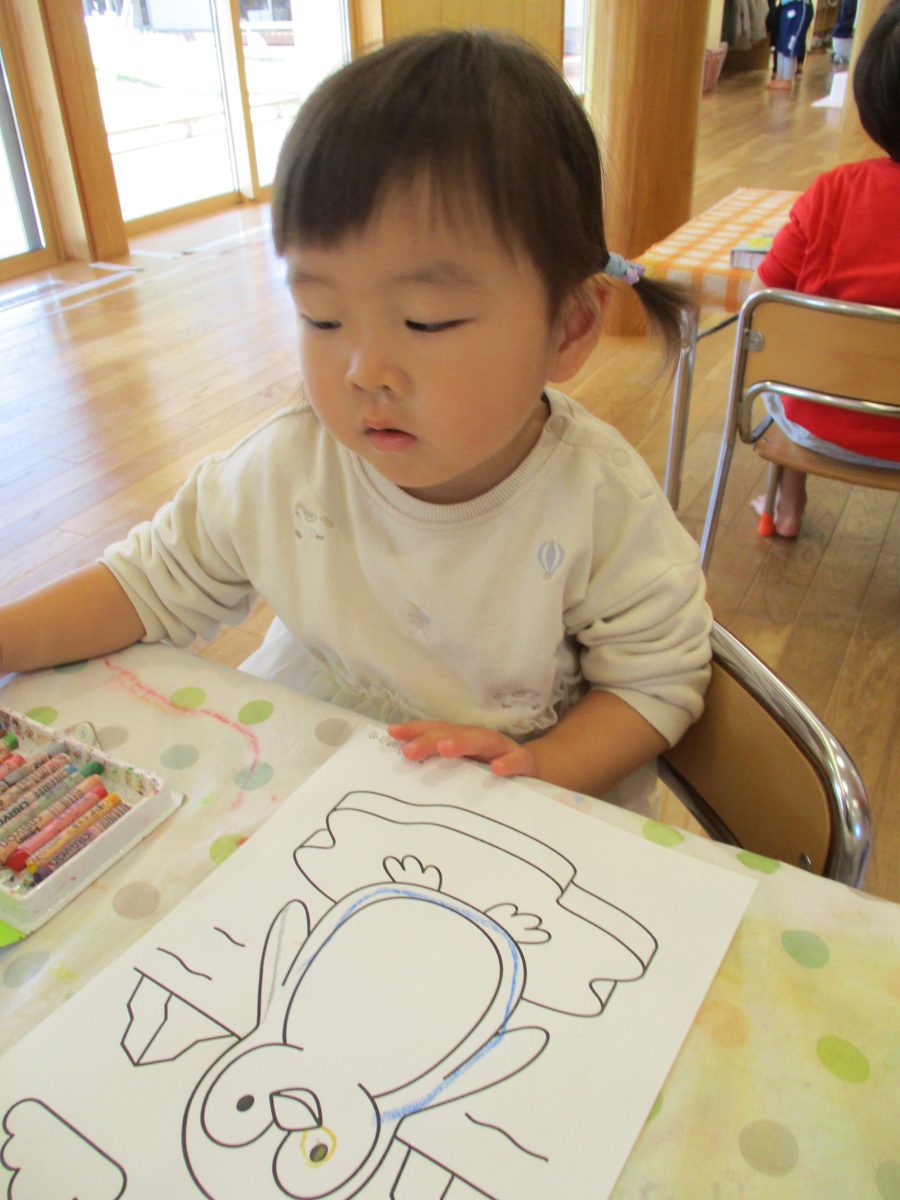 今日は不審者を想定した避難訓練がありました!こわ~い不審者さんが来るまで、お部屋でぬり絵をして過ごしました!見本と同じ色で塗れるかな?🖍️