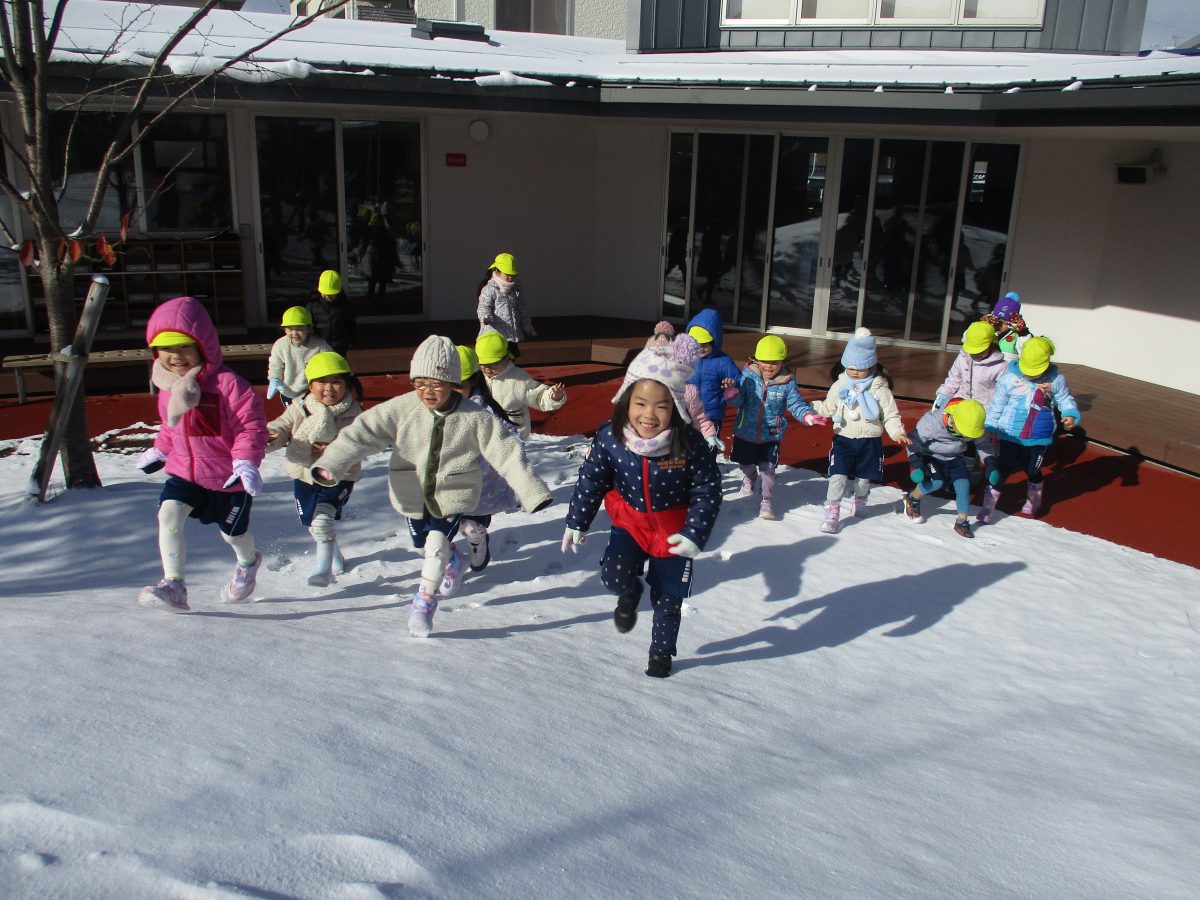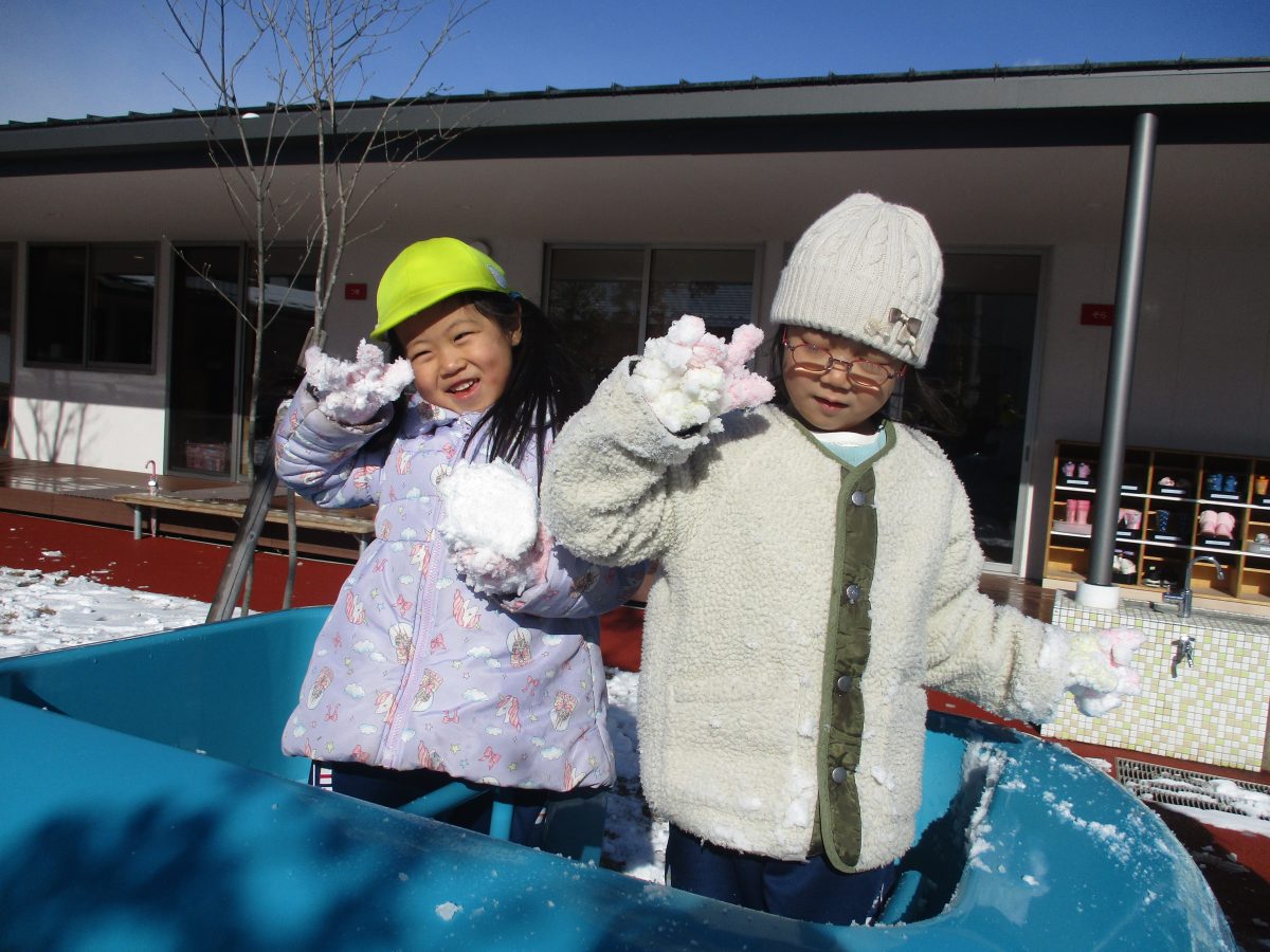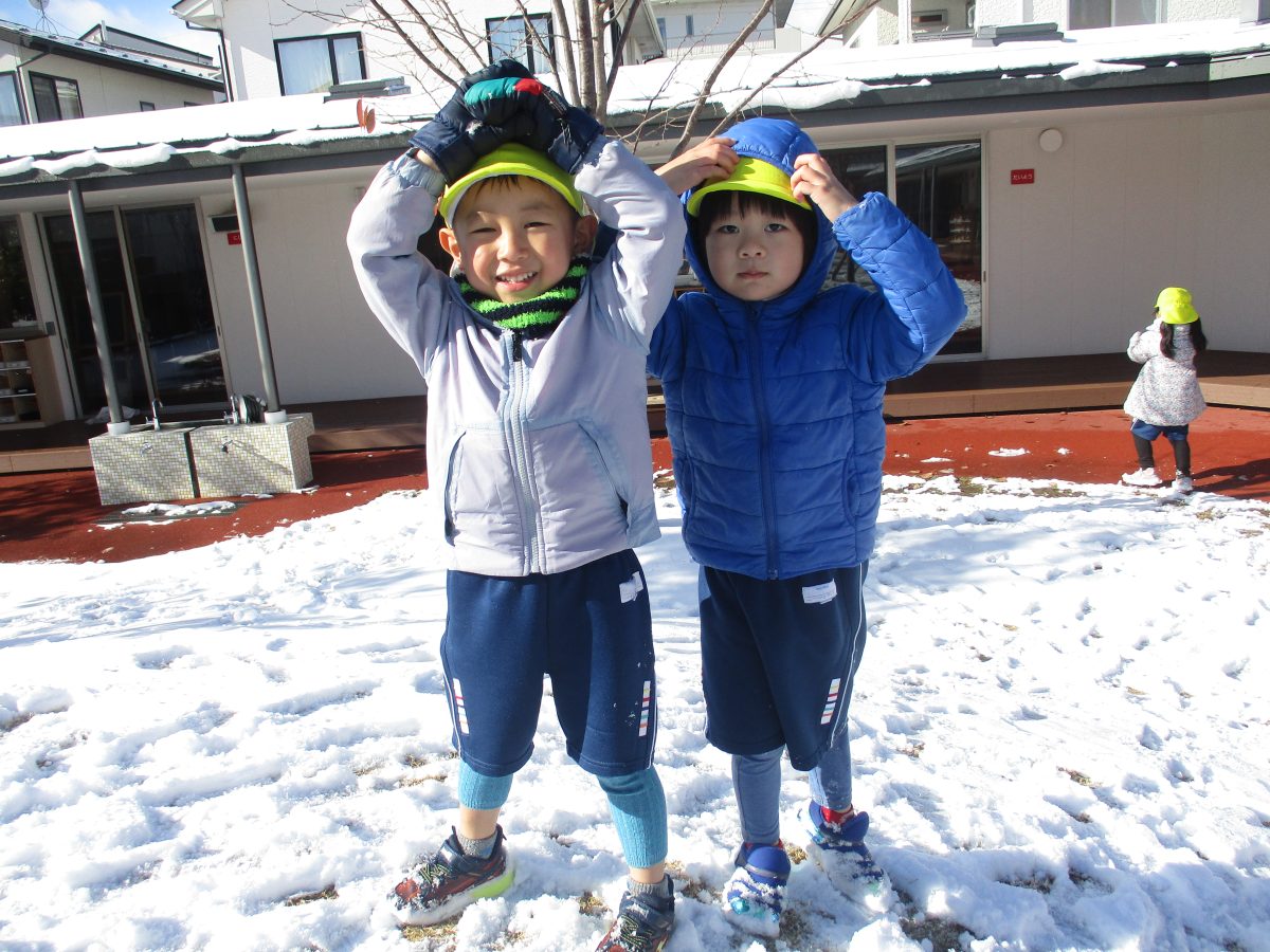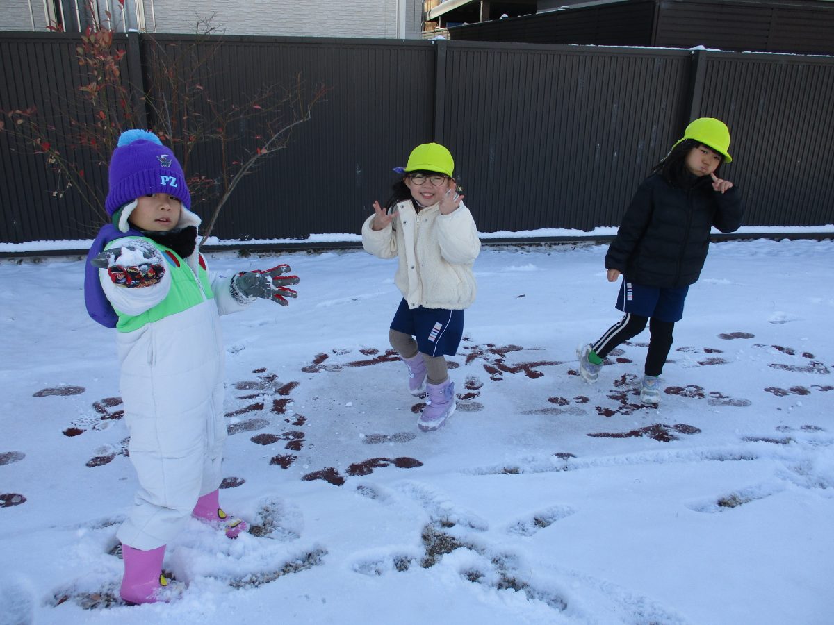 子ども達は、「真っ白~!」「雪遊びできるかな?」と、朝から元気いっぱいでした😄