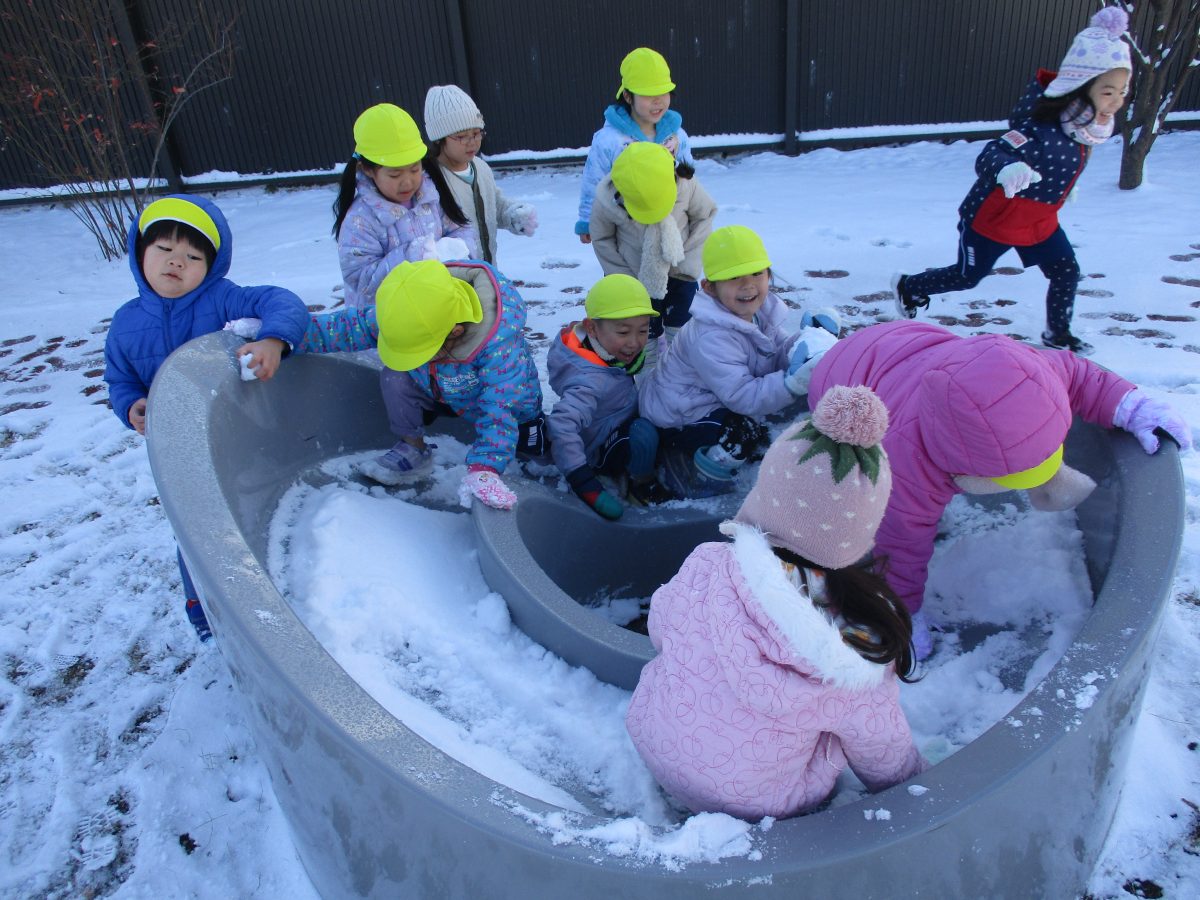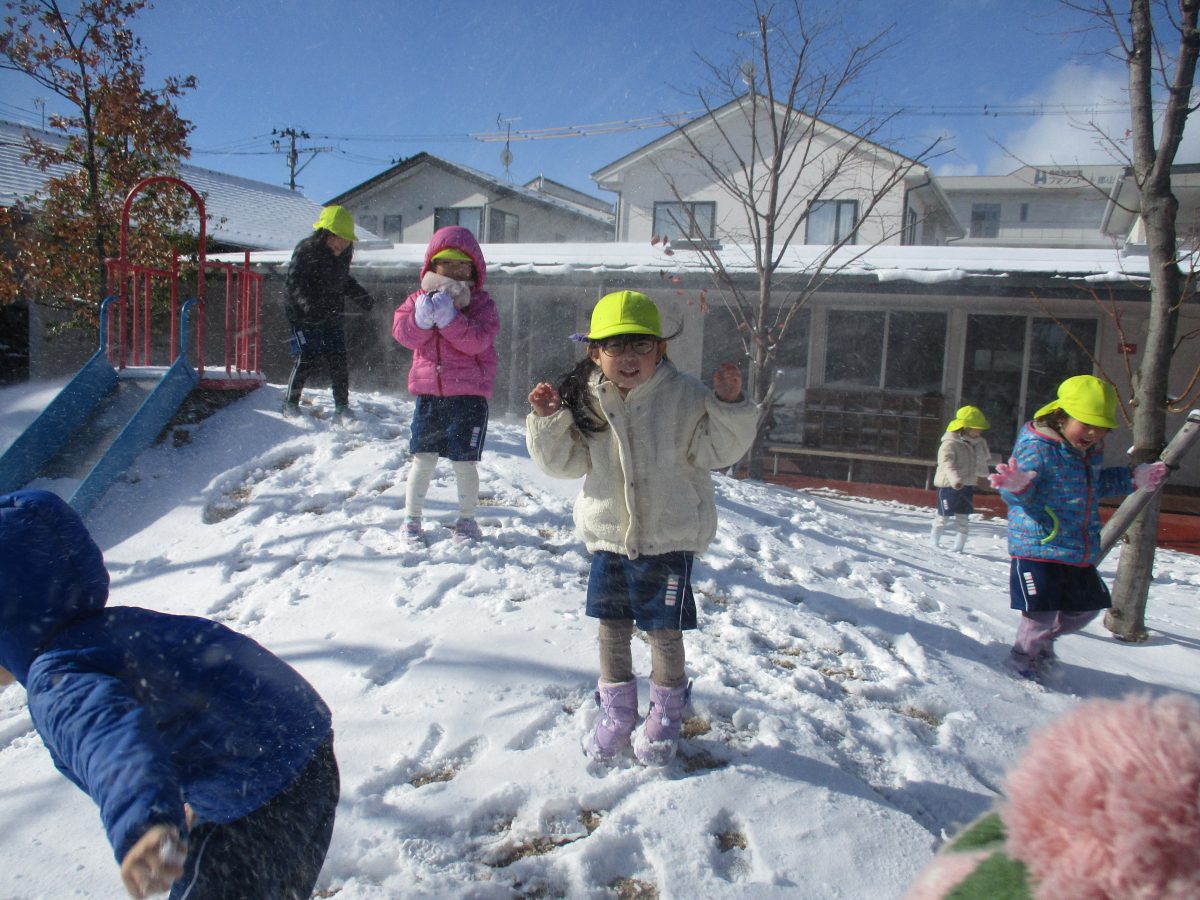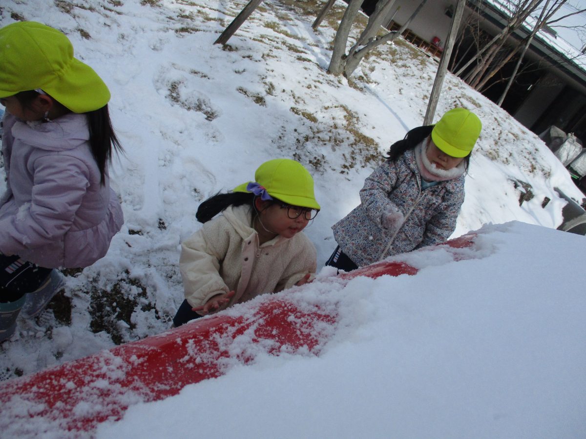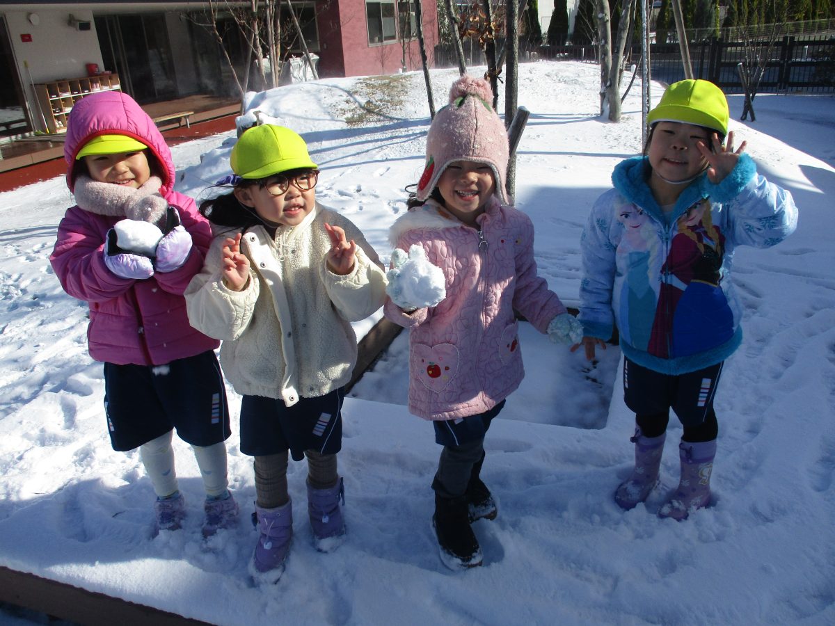 子ども達は、「真っ白~!」「雪遊びできるかな?」と、朝から元気いっぱいでした😄