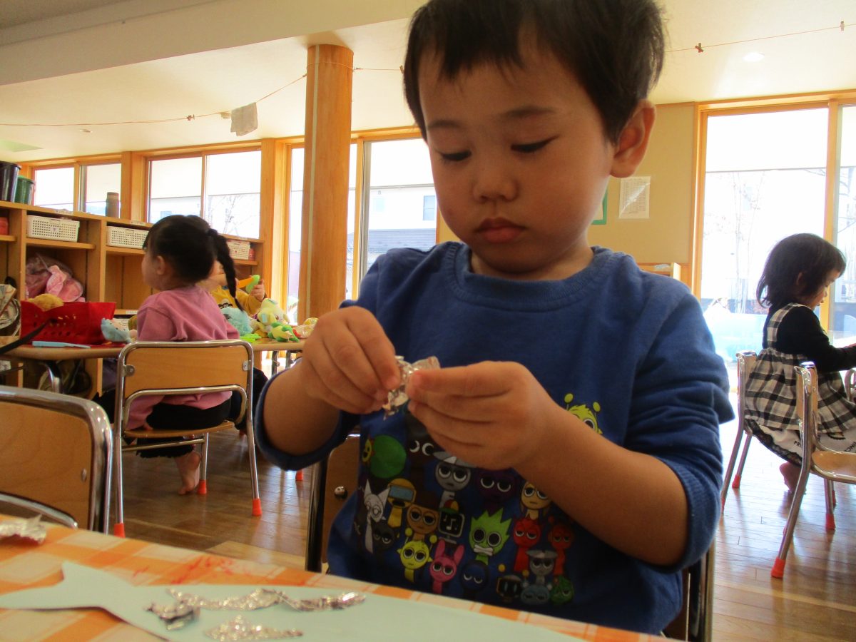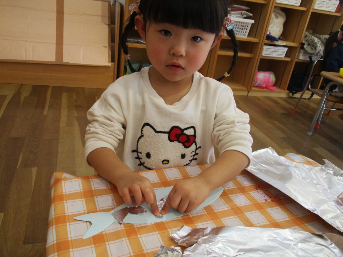 今日はアルミホイルを千切って張り付けて、11月のサンマの製作をしました!🐟
