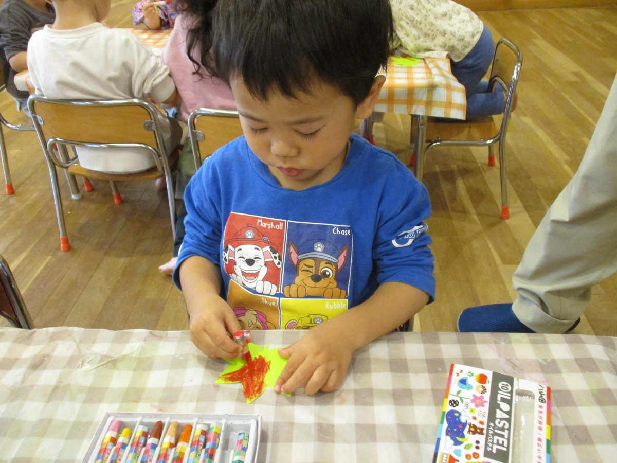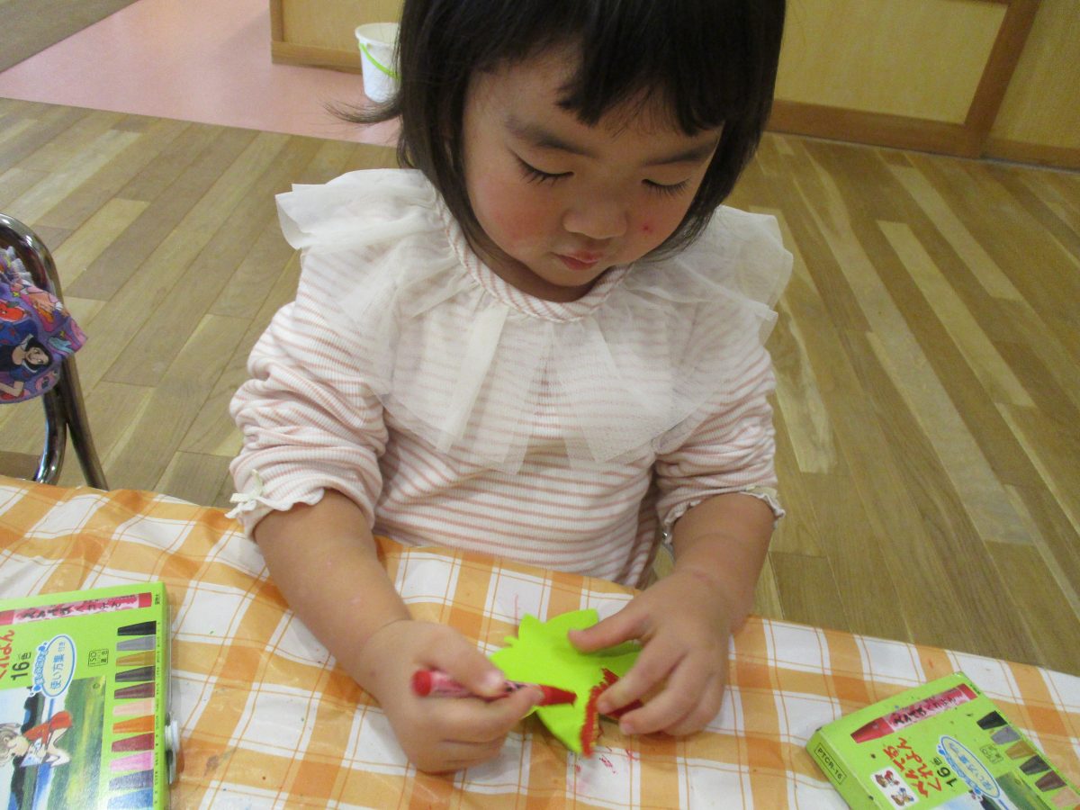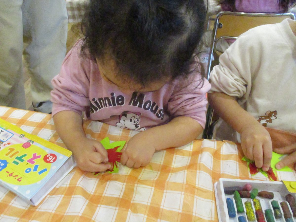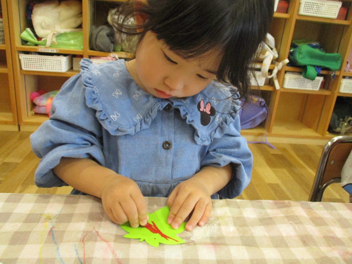 今日は11月の製作をしました!園庭の紅葉を見ながら、黄緑色の紅葉を赤いクレヨンで色付けをしました!🍁