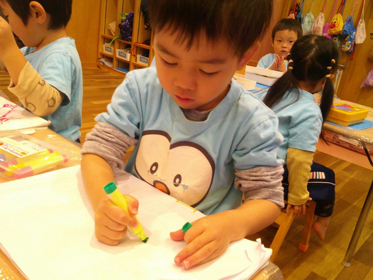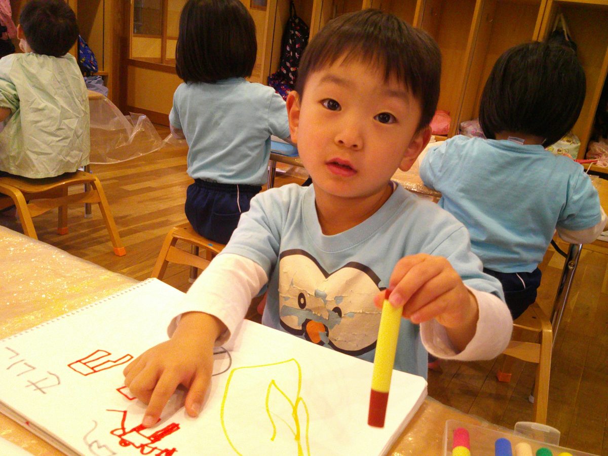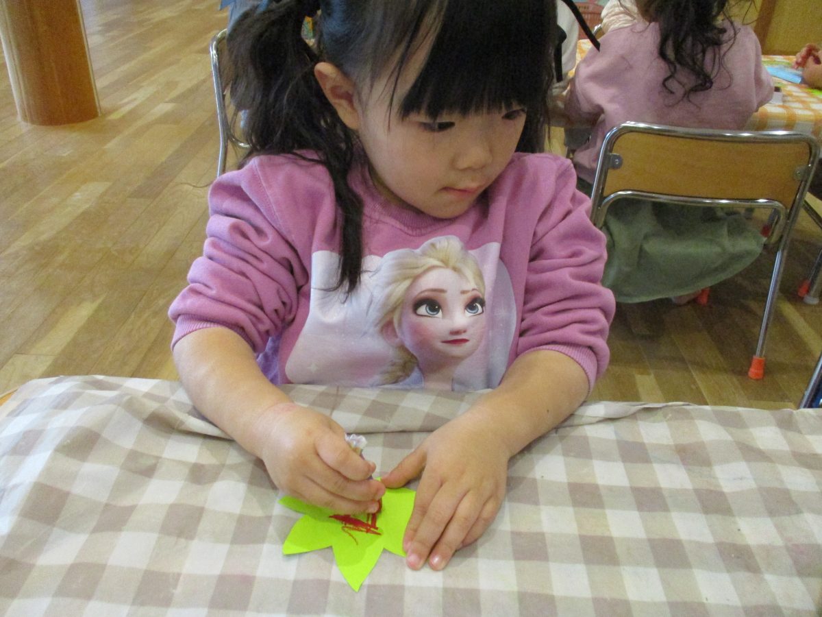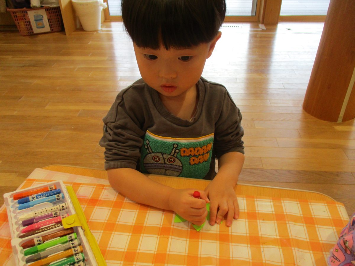 今日は11月の製作をしました!園庭の紅葉を見ながら、黄緑色の紅葉を赤いクレヨンで色付けをしました!🍁